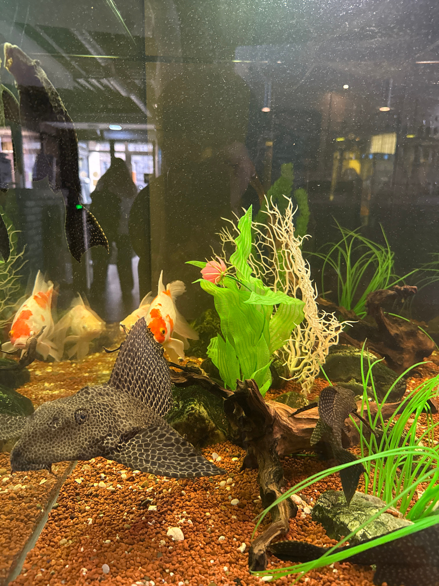 The image shows an indoor fish tank. Inside the tank, there are several goldfish with white and orange coloration swimming among artificial plants and driftwood. Two large Plecostomus catfish are visi…read more