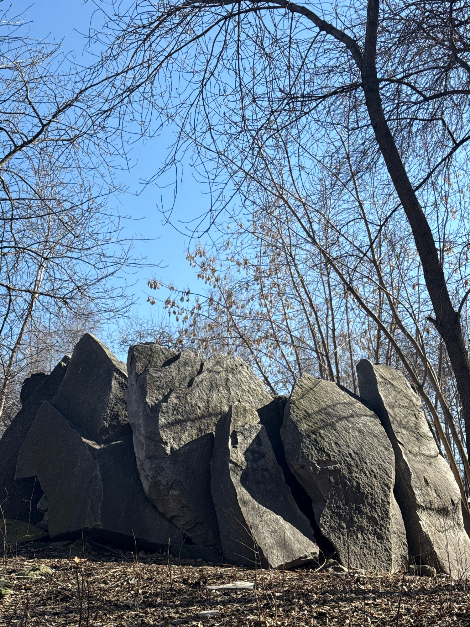 The image shows a rock formation and bare tree branches against a clear blue sky. The rocks are stacked in a somewhat precarious manner. A tree trunk covered in vines is visible to the right of the ro…read more