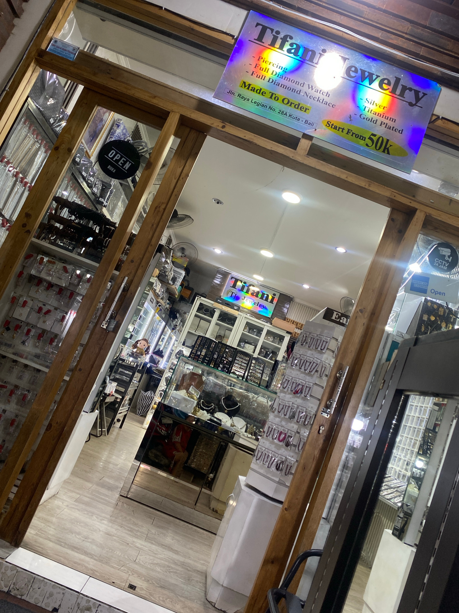 This image captures the interior of a jewelry store named "Tifani Jewelry" or "Tifani TJ Jewelry," viewed from just outside the entrance at an angled perspective. The store appears brightly lit and reβ¦read more