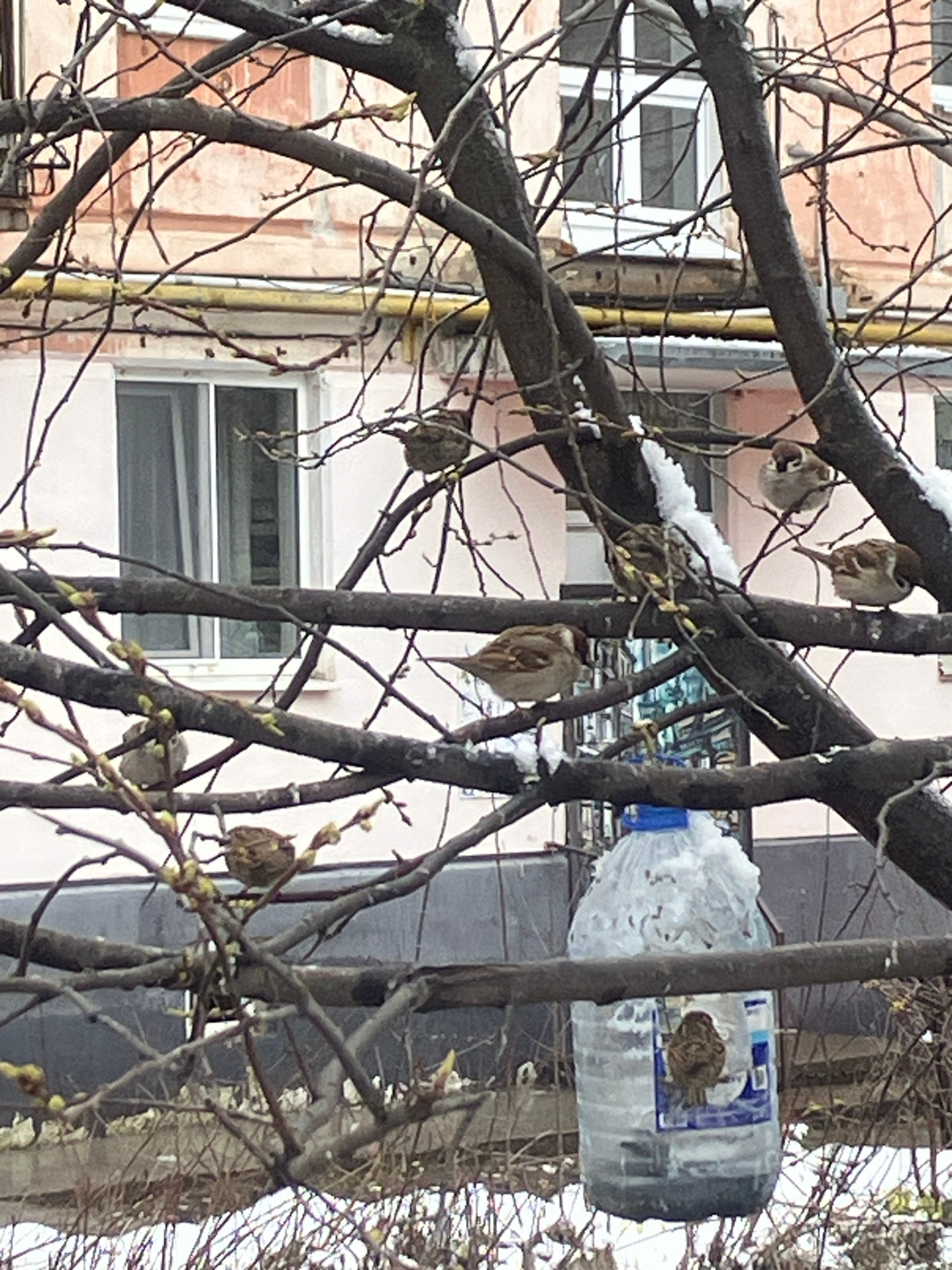 The image depicts a group of Eurasian tree sparrows perched on bare tree branches, some dusted with snow. In the background, there is a pink-colored building with windows and a homemade bird feeder co…read more