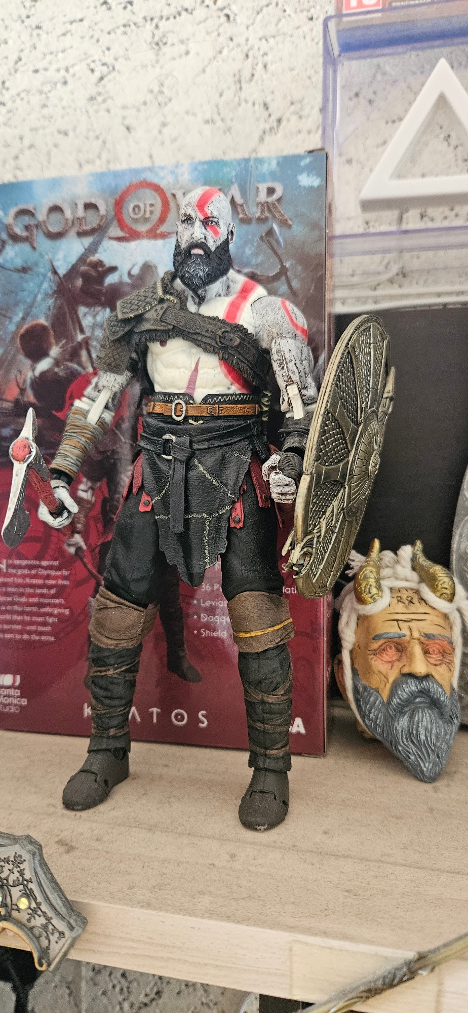 The image shows a Kratos action figure from the God of War video game series lying on top of a God of War game box. The figure is clad in black clothing with brown accents and wielding a shield and anβ¦read more