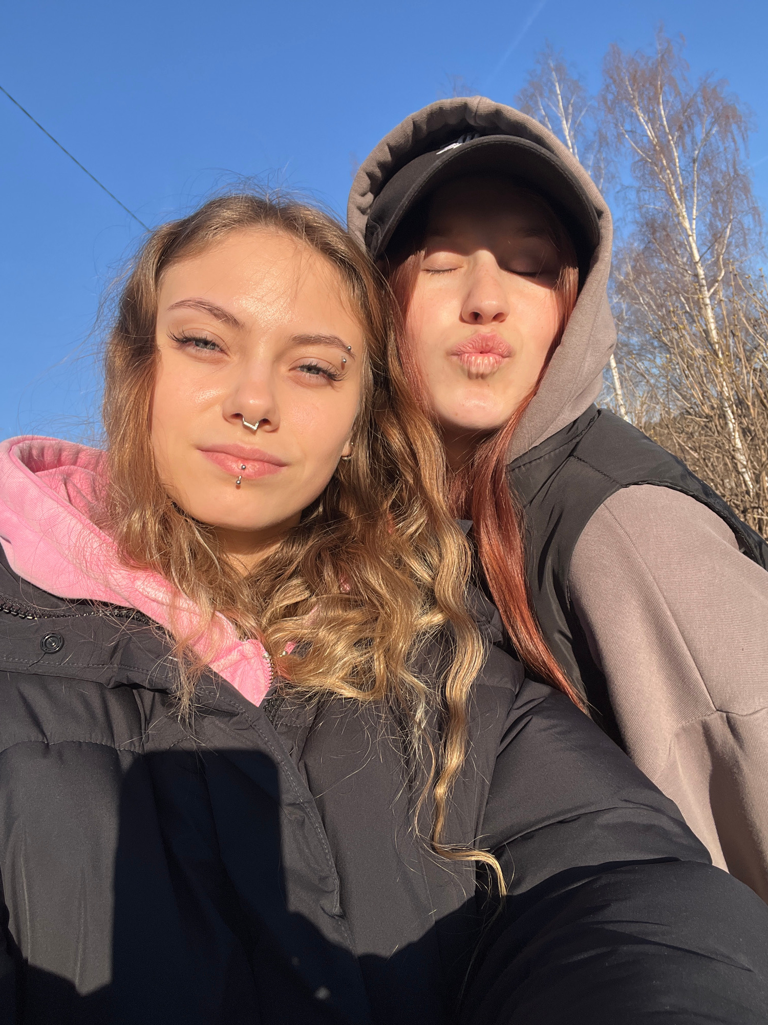 Two young women are posing for a selfie outdoors, likely in Фоки, Russia given the prompt. The foreground woman has blonde, curly hair and visible facial piercings on her eyebrow, nose, and lip. She i…read more