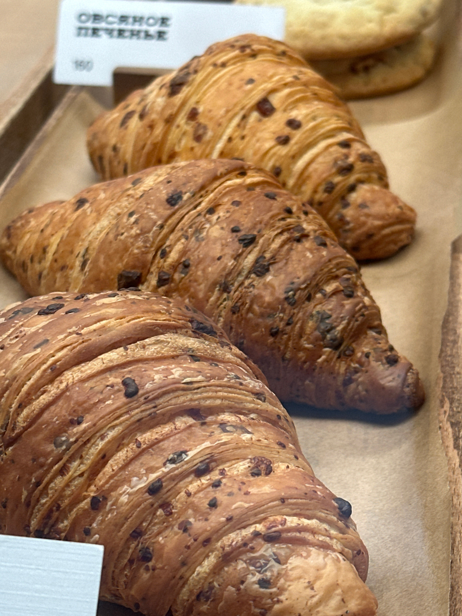 The image provides a close-up view of three golden-brown croissants, likely chocolate croissants, arranged diagonally on a display surface. The pastries exhibit a flaky, layered texture, characteristi…read more