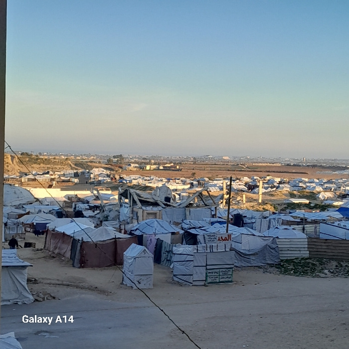 A crowded refugee camp extends to the horizon under a clear sky. Makeshift shelters, tents, and temporary structures are densely packed. A dirt road runs along the side of the camp. Boxes and supplies…read more
