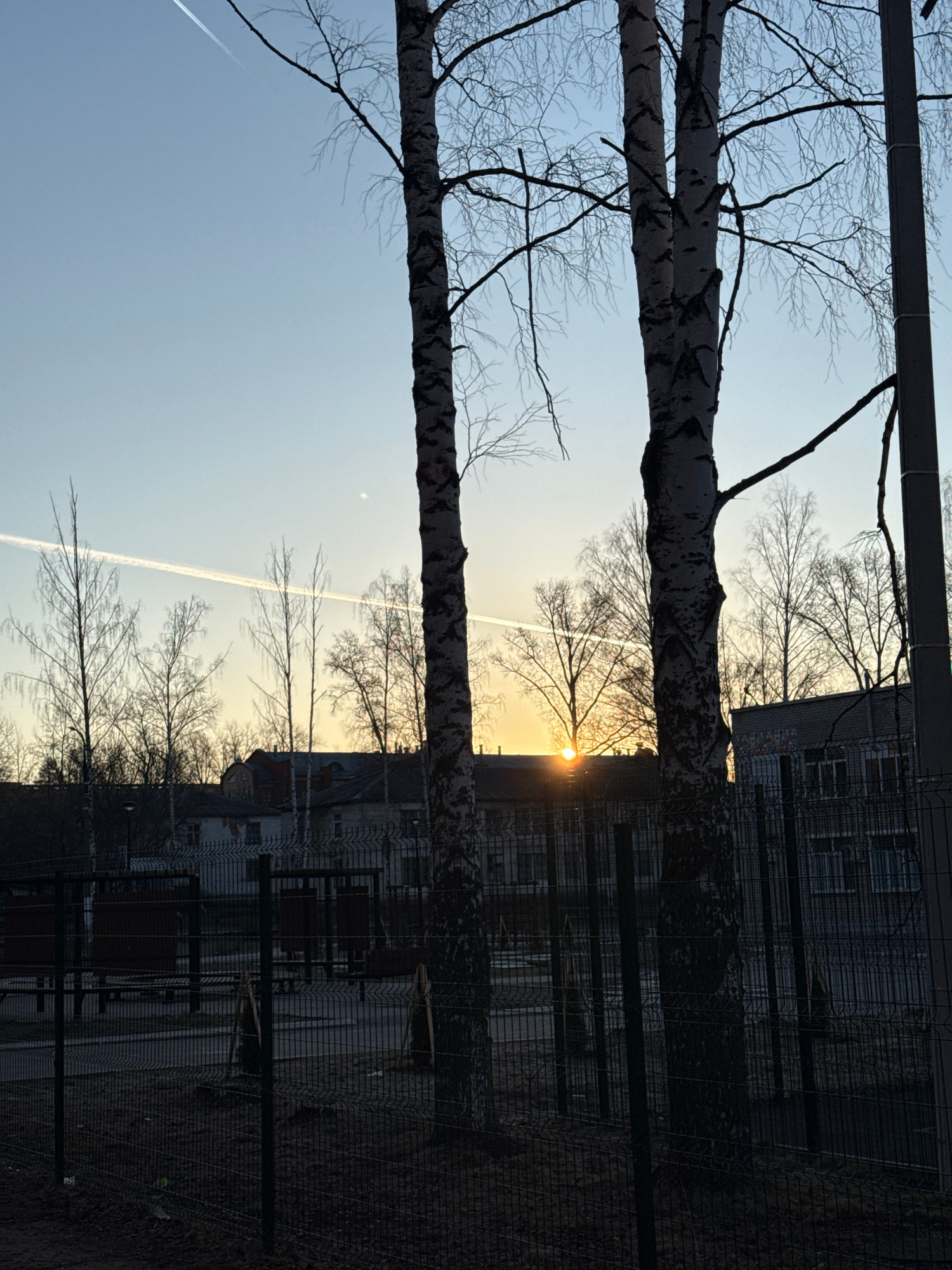 A low-angle view captures a serene sky at sunrise or sunset, as evidenced by the bright orb peeking between the branches of leafless birch trees. Two prominent birch trunks, characterized by their dis…read more