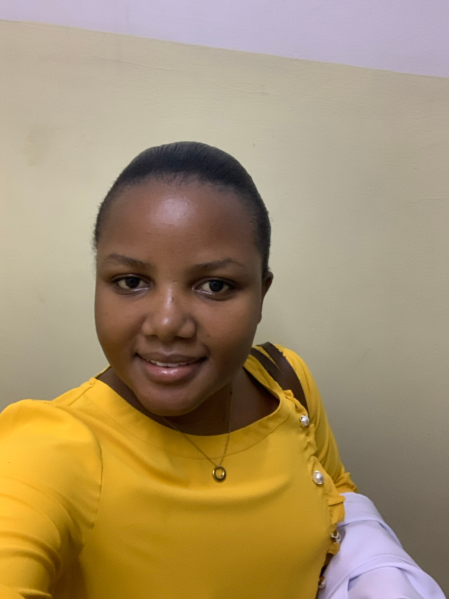A young woman is looking at the camera, smiling. She is wearing a yellow top with a gold necklace. The background is a plain light yellow wall. It is impossible to determine if this image was taken in…read more