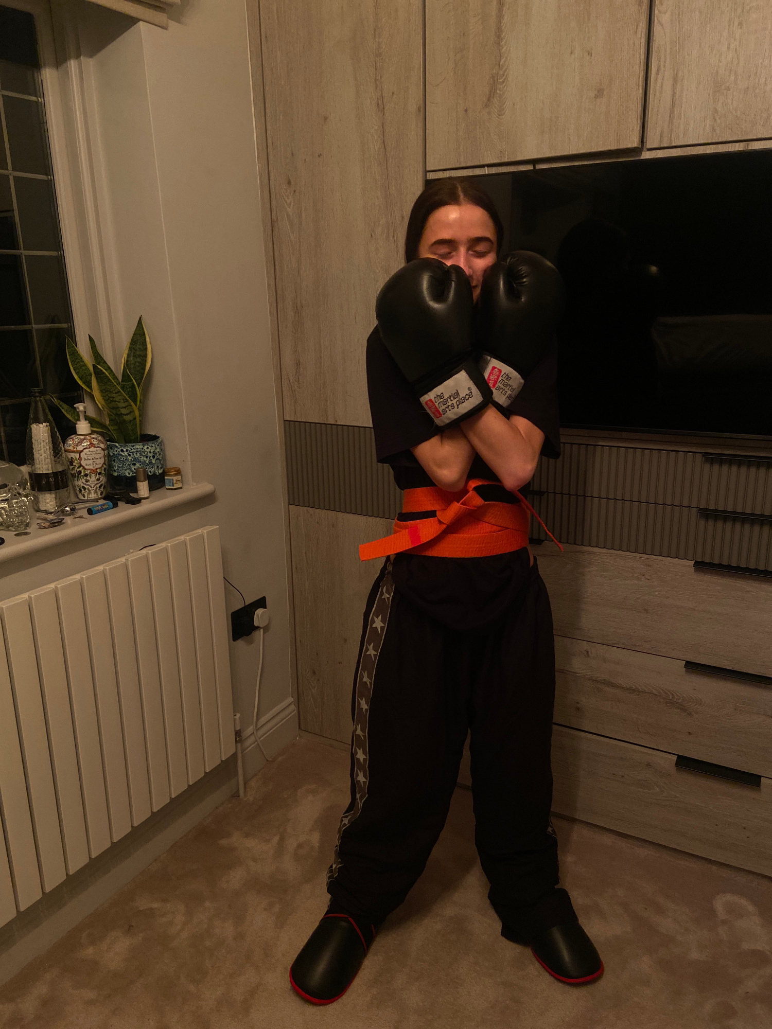 A person is lying on the floor, wearing black boxing gloves and a black martial arts outfit with a red-orange belt. The person is positioned near a wardrobe with a grey-toned wood finish, and their he…read more