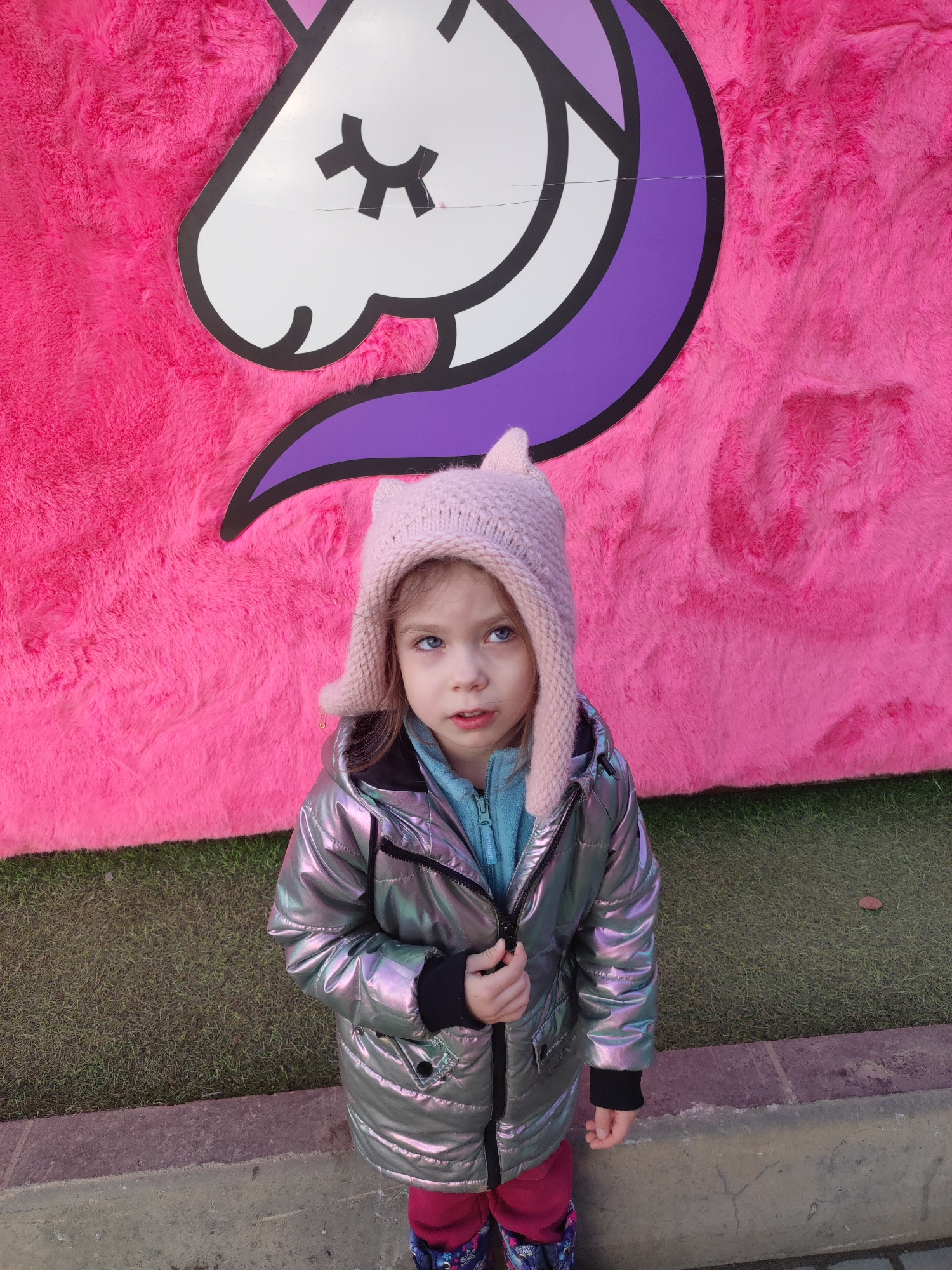 A young child stands in front of a large, pink, furry backdrop in Votkinsk, Russia. The backdrop features a cartoonish image of a white unicorn head with a purple mane. The child wears a pink knit hat…read more