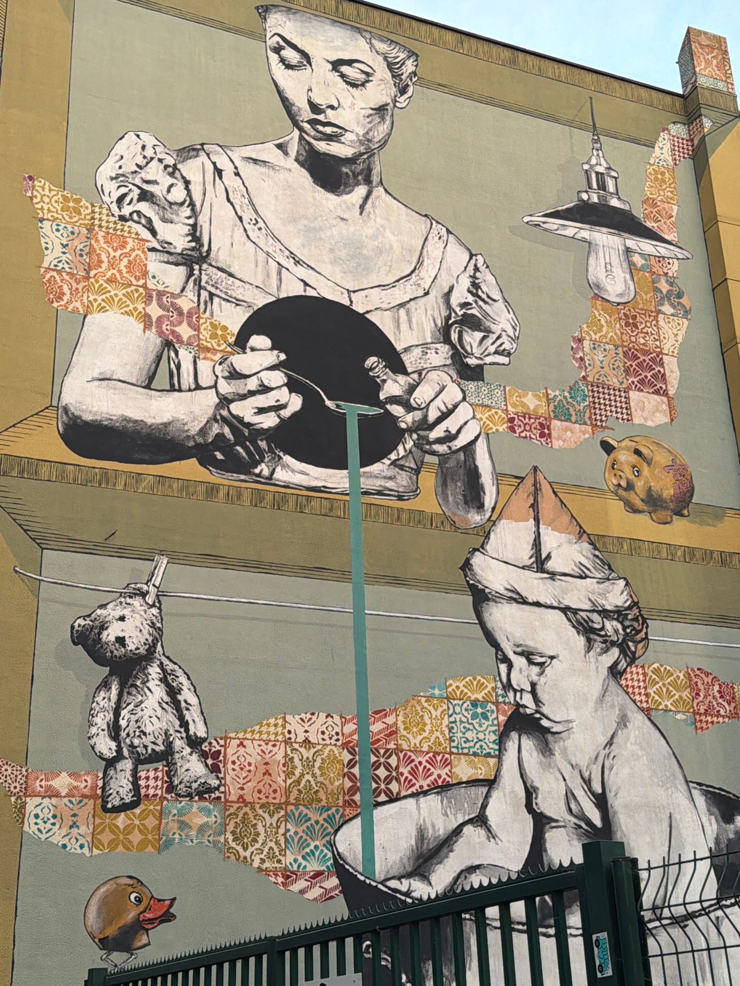 The image shows a mural on a building in Aubervilliers, France. The mural features a collage-like design with grayscale drawings of a figure pouring liquid into a dark circle, disembodied hands, a toy…read more