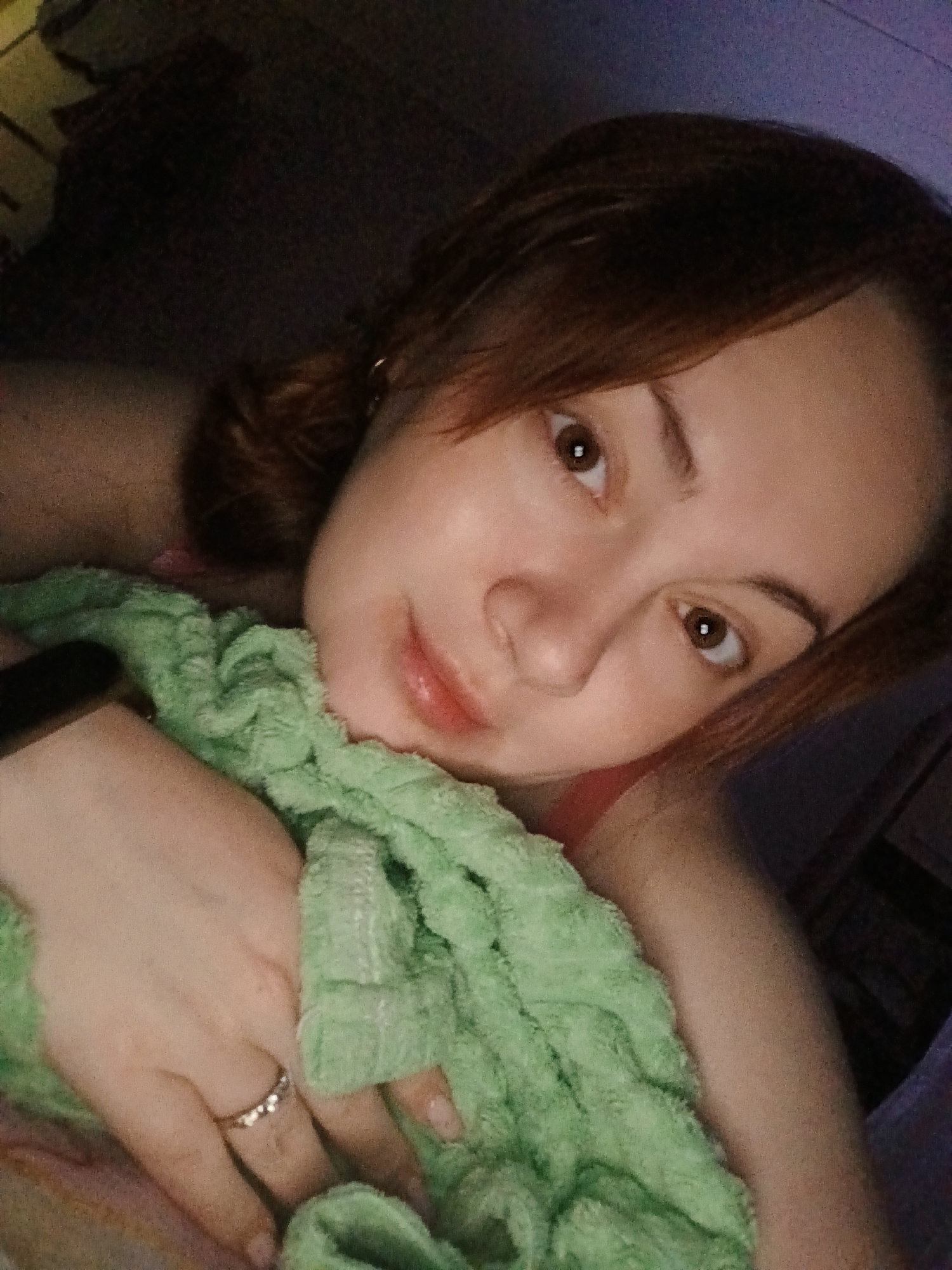 A woman is pictured in an indoor setting. She is lying down, with her head tilted slightly towards the camera. She has fair skin, brown eyes, and brown hair pulled back. She is holding a green, textur…read more