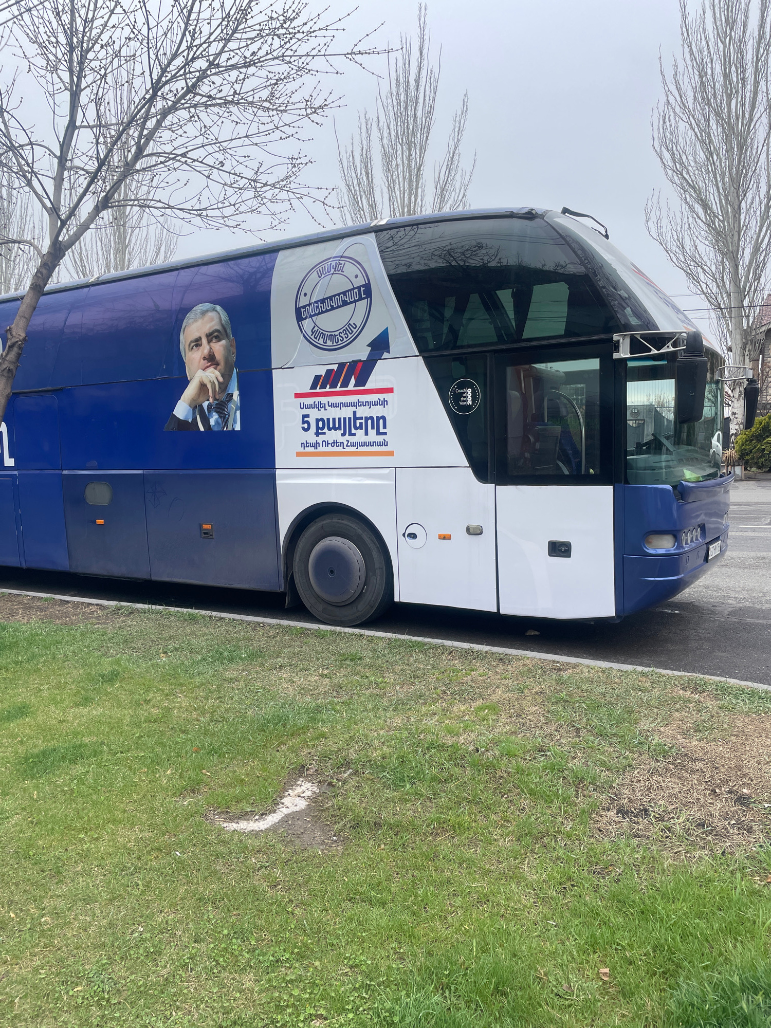 A large commercial coach bus, painted in a two-tone royal blue and white livery, is parked parallel to a paved road in Yerevan, Armenia. The side of the bus displays a prominent vinyl wrap featuring a…read more