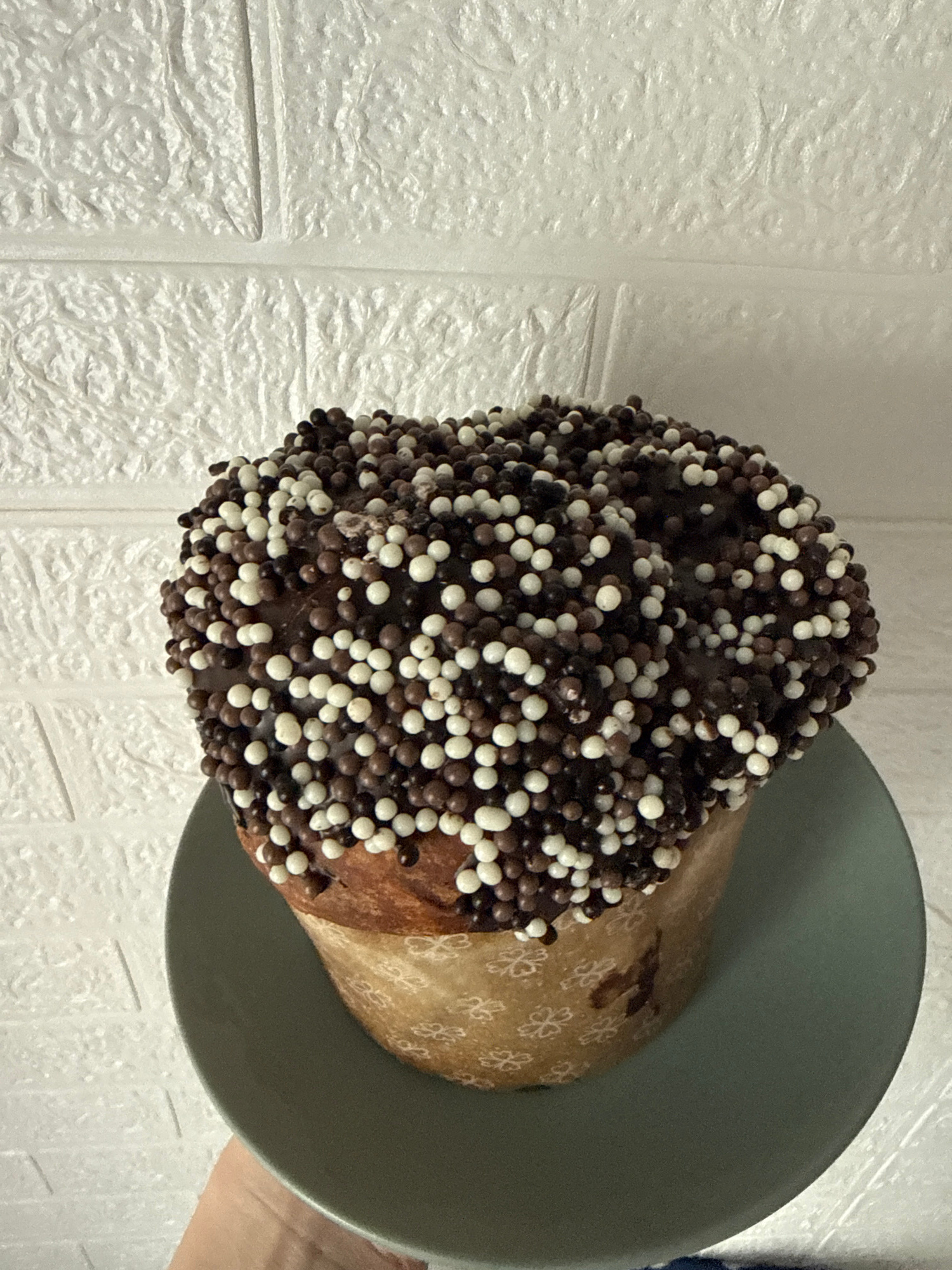 The image shows a chocolate-covered panettone on a green plate. The panettone is decorated with small white and brown chocolate spheres. The background is a white, textured wall. There is no indicatio…read more