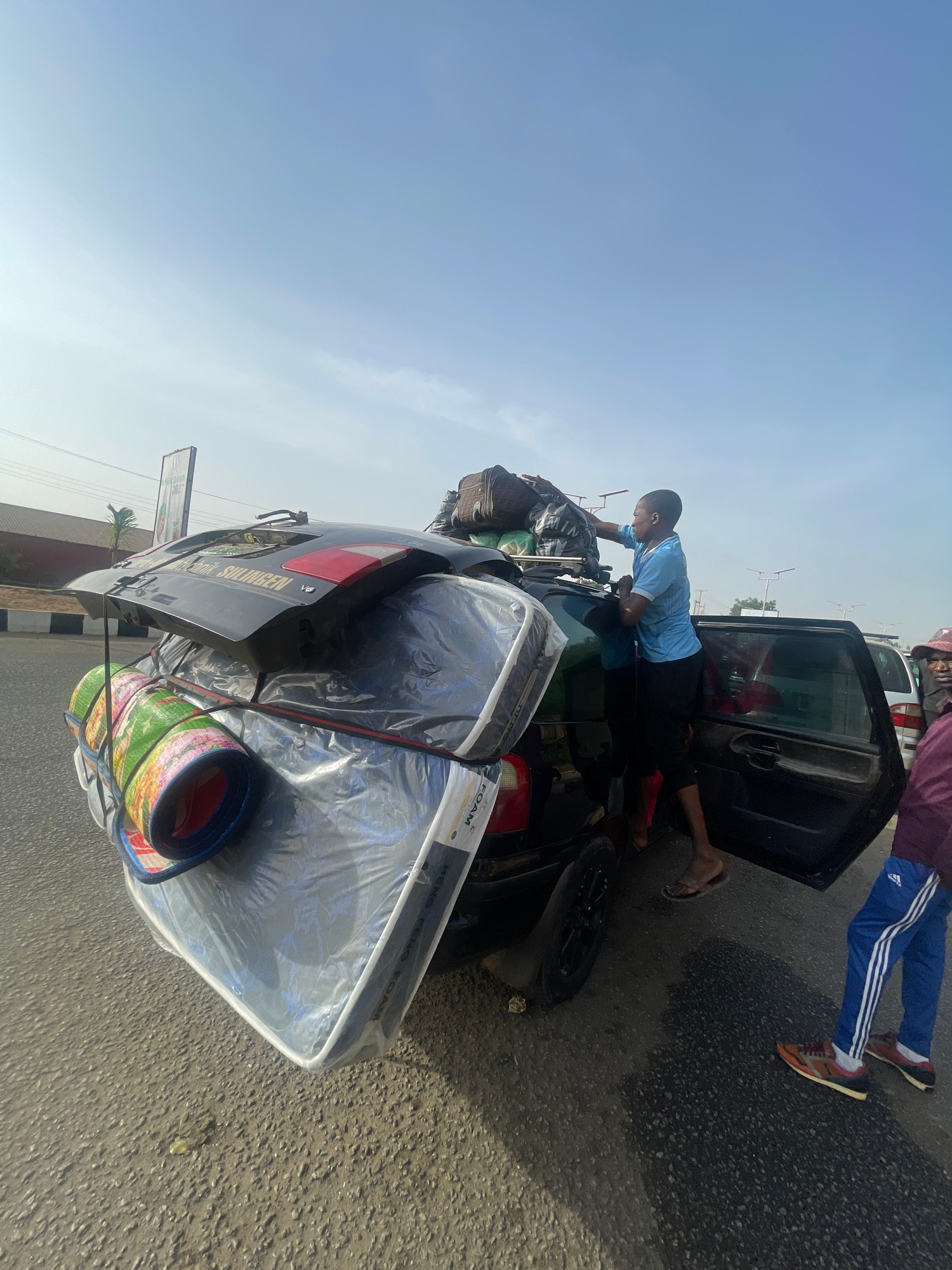 The image shows a black sedan overloaded with items on its roof, secured with straps. A man in a light blue shirt is positioned on the roof, appearing to adjust or secure the load, which includes lugg…read more