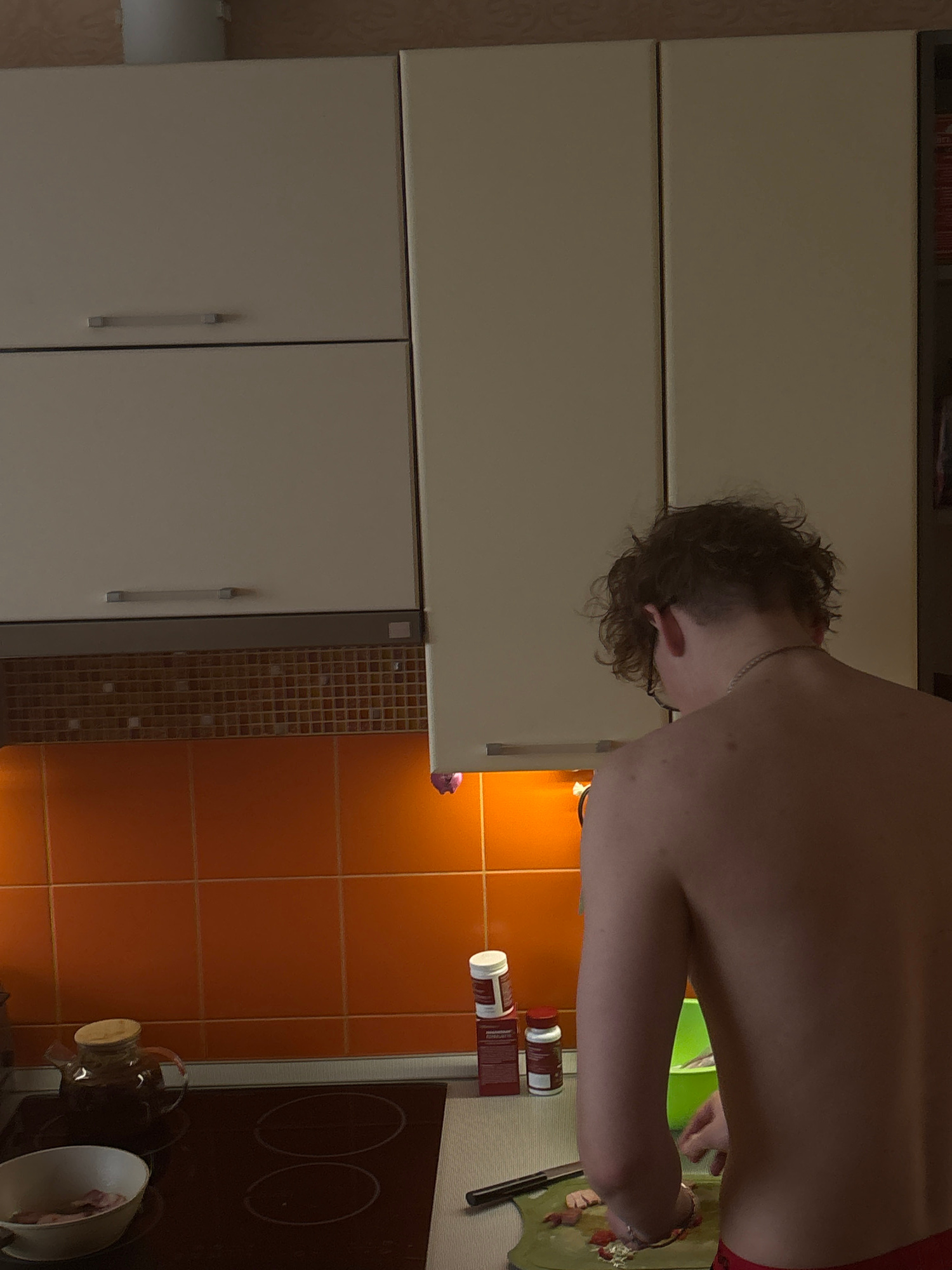 The image shows the interior of a kitchen. A shirtless person is standing at a counter preparing food. Their head and upper torso are visible. They have curly brown hair and are wearing a necklace. Th…read more