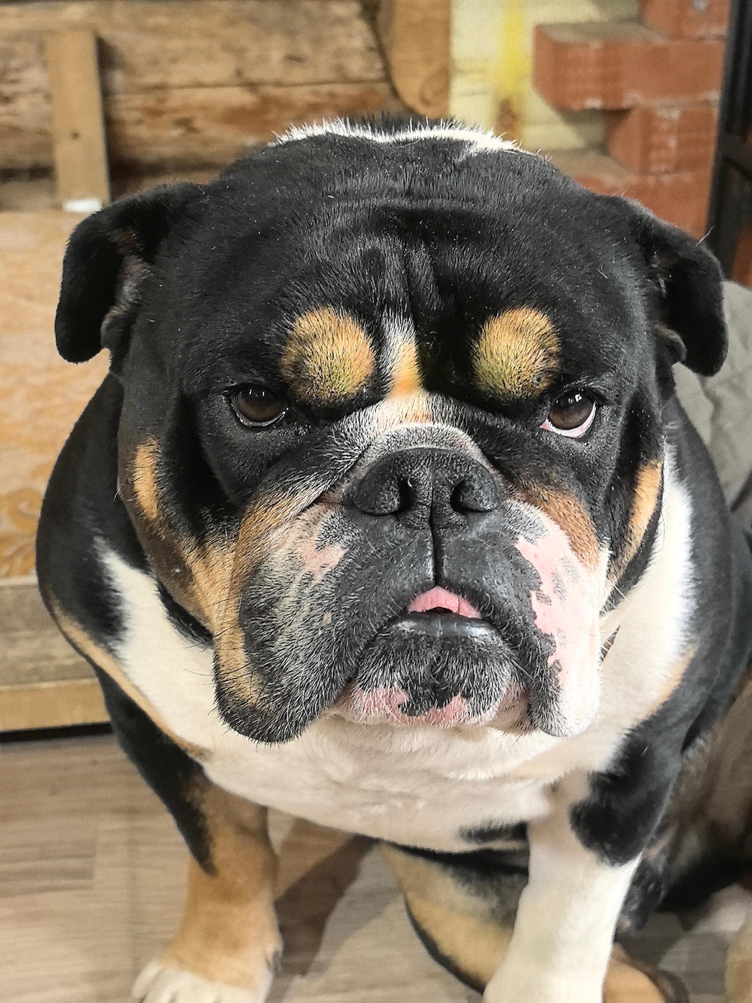 A close-up, high-angle shot shows an English Bulldog with a serious expression. The dog has a black, white, and tan coat. Its face is wrinkled, and its tongue is slightly visible. The background is bl…read more
