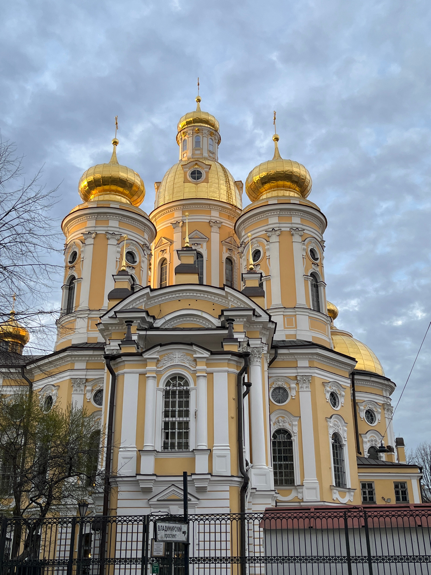 The image captures a close-up, slightly angled view of the Saint Nicholas Naval Cathedral in St. Petersburg, Russia. The cathedral's architectural elements are prominently displayed, showcasing its go…read more