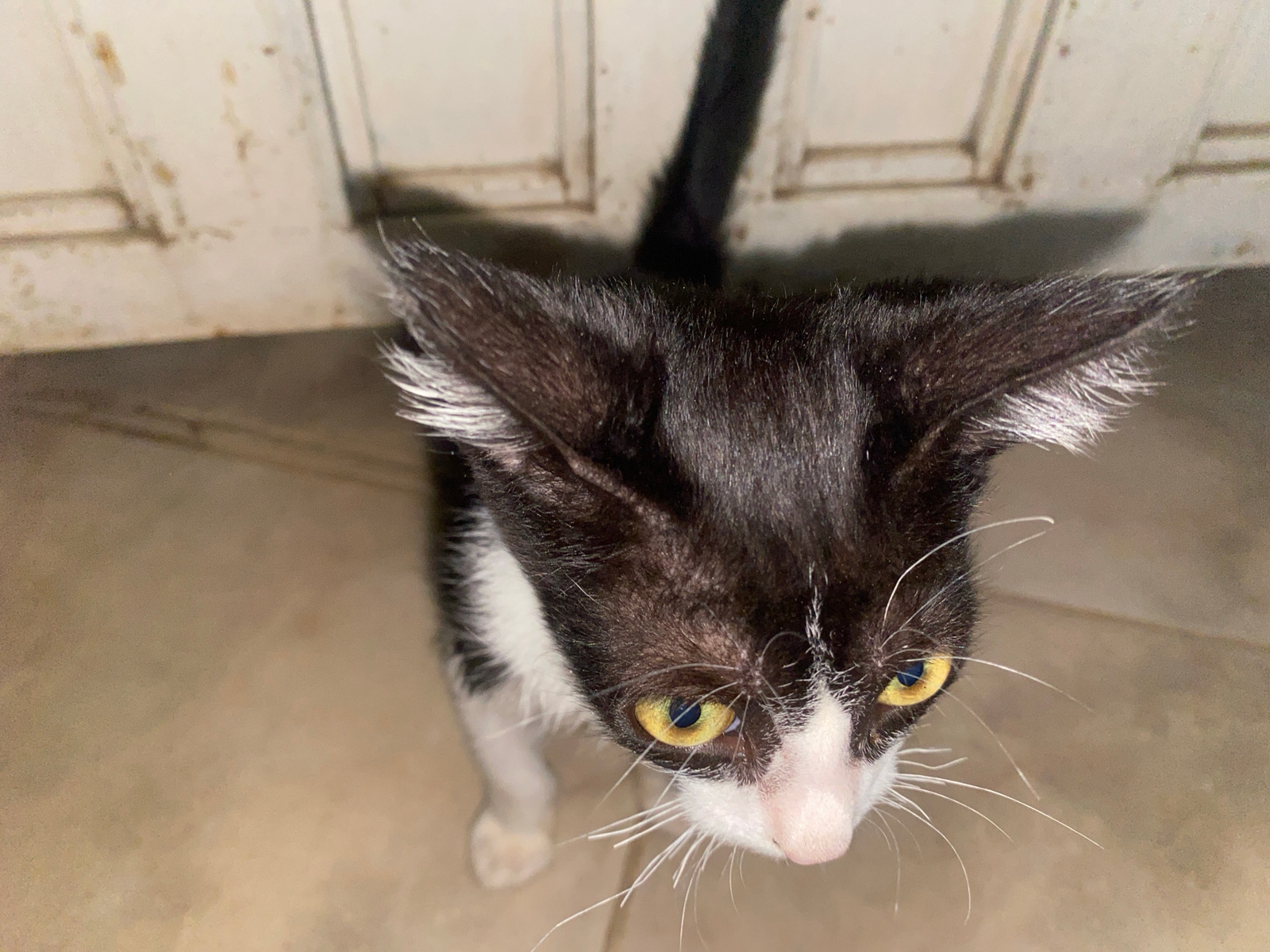 A black and white kitten is looking up at the camera. The kitten is standing on a tile floor, and a white door is visible in the background. The kitten is in Tinaquillo, Venezuela.