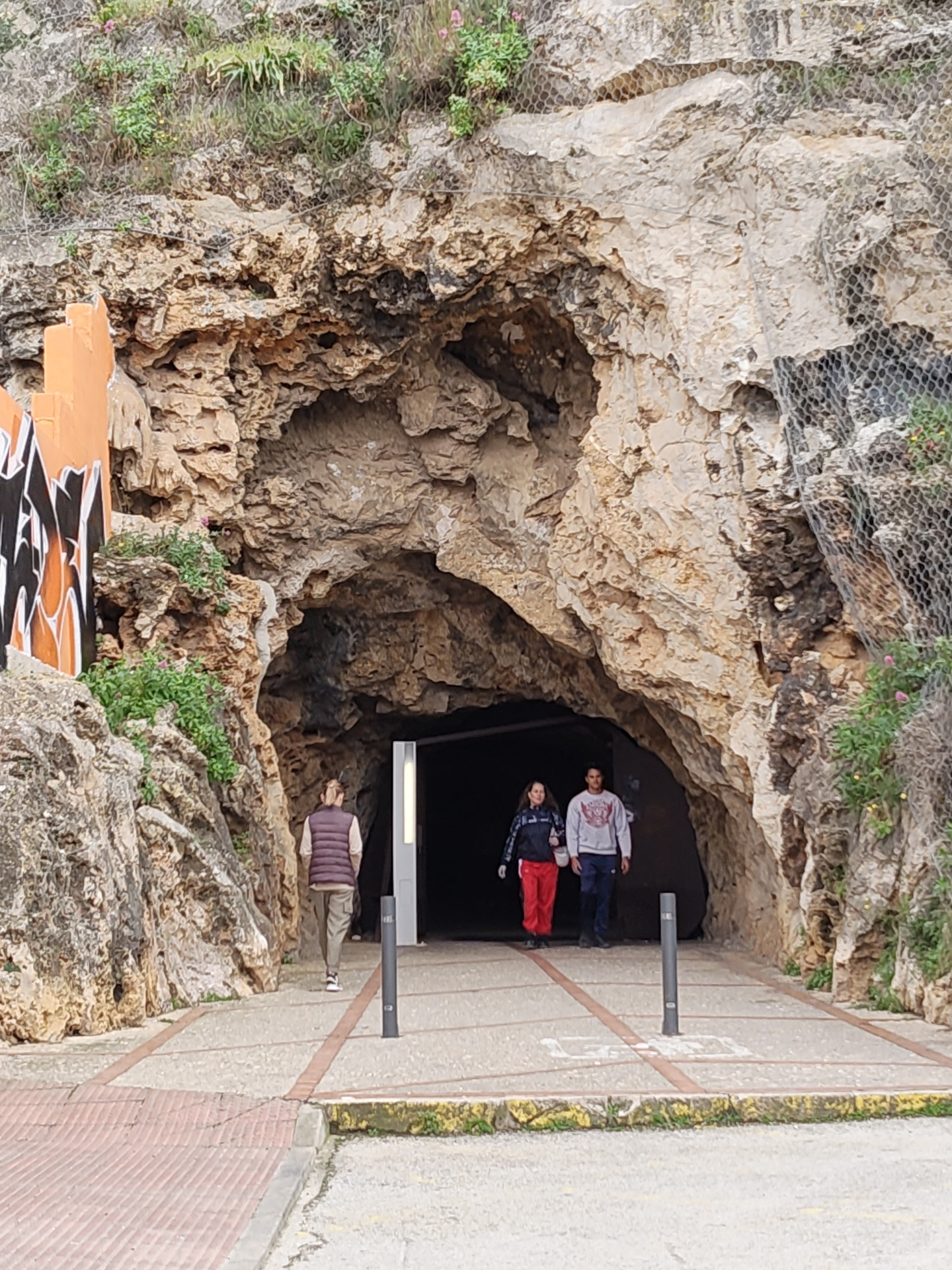 The image depicts the entrance to a tunnel in Dénia, Spain. The tunnel is carved into a light-colored, textured rock face that has vegetation growing on top. A wire mesh covers part of the right side…read more