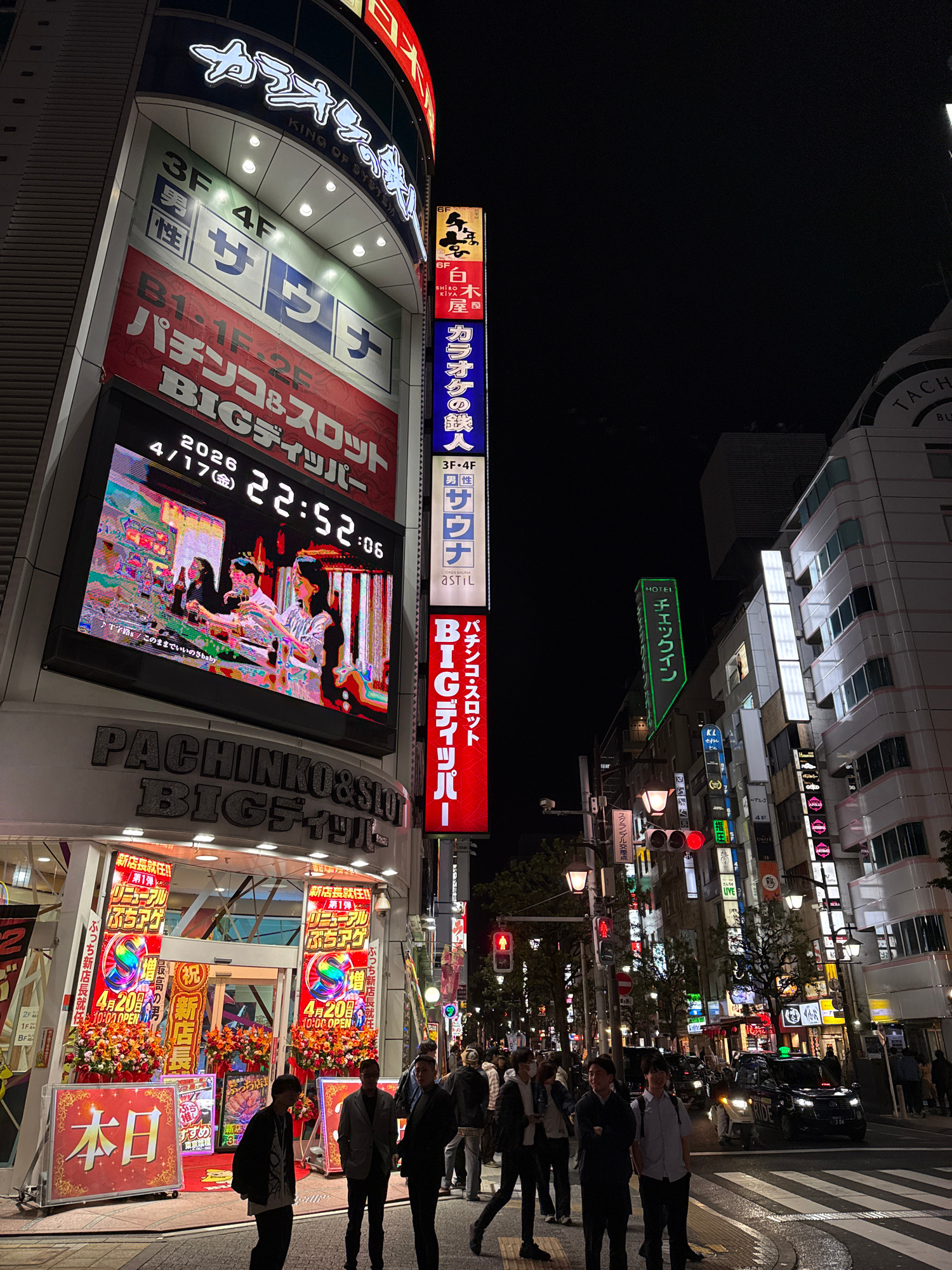 This nighttime image captures a vibrant and bustling street scene in Minato, Japan, illuminated by numerous neon signs and building lights. Several people are walking on the sidewalk and crossing a st…read more