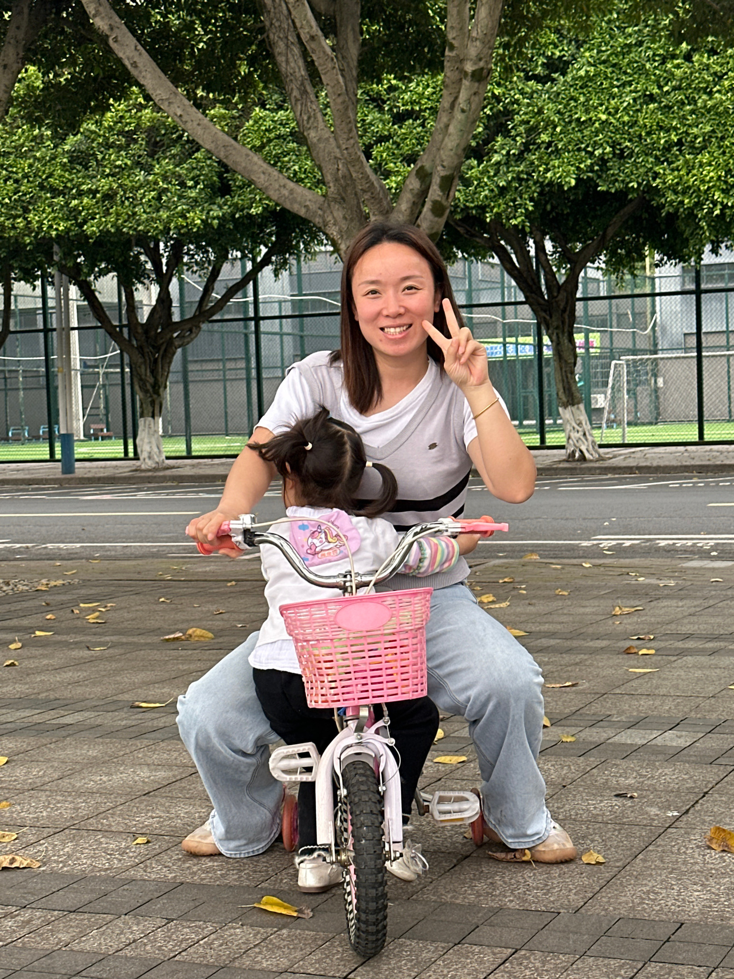 The image shows an adult woman and a young child on a bicycle on a paved area, likely a sidewalk, next to a road in Jiangjin, China. The woman is smiling and holding up a peace sign with one hand. She…read more