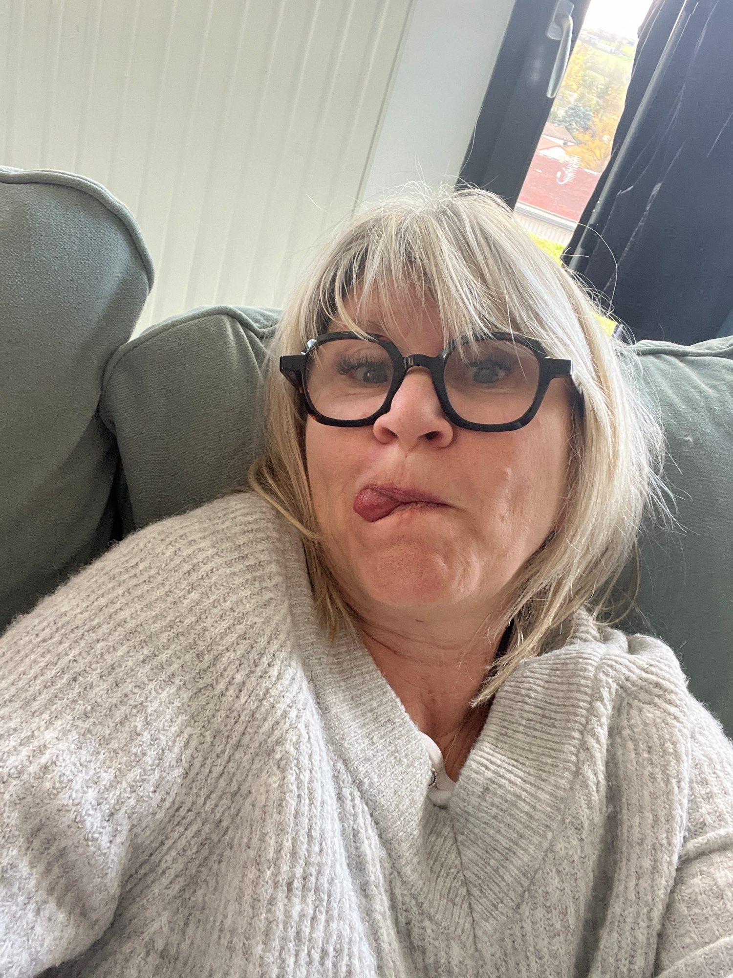 A medium shot depicts a fair-skinned, blonde woman with visible wrinkles and wearing black-rimmed glasses lying on a green upholstered chair. The woman is partially obscured by a light grey knit sweat…read more