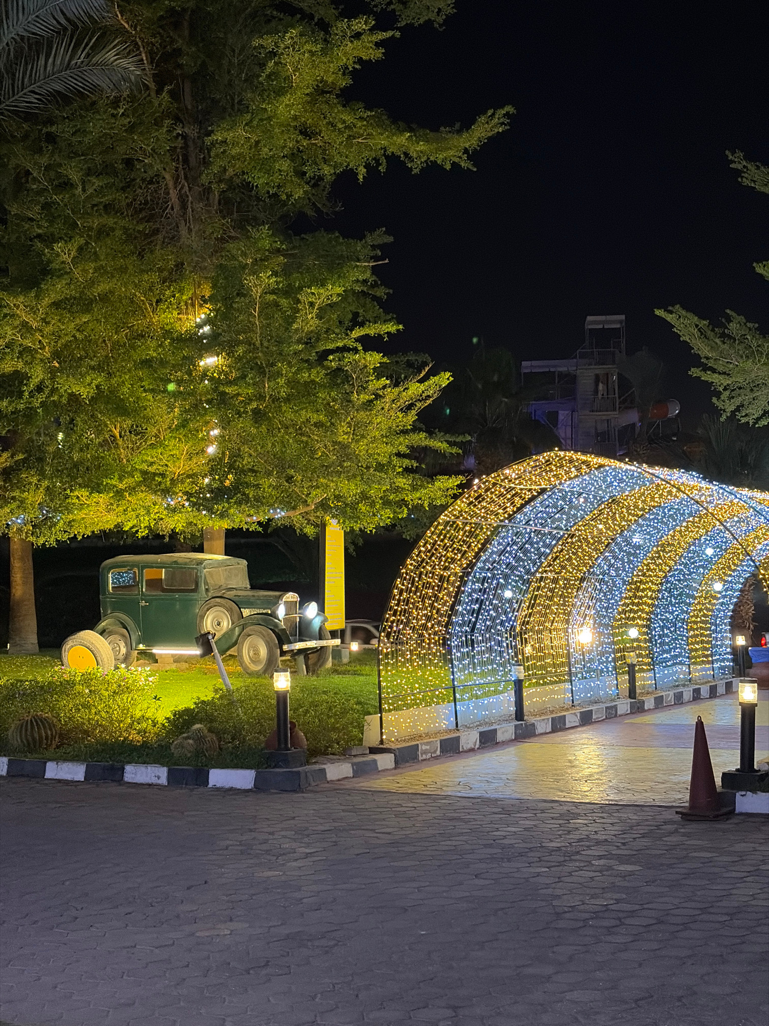 The photograph, taken in Sharm El Sheikh, Egypt, depicts a scene at night. The most prominent feature is an illuminated structure adorned with alternating horizontal bands of white and yellow lights,…read more