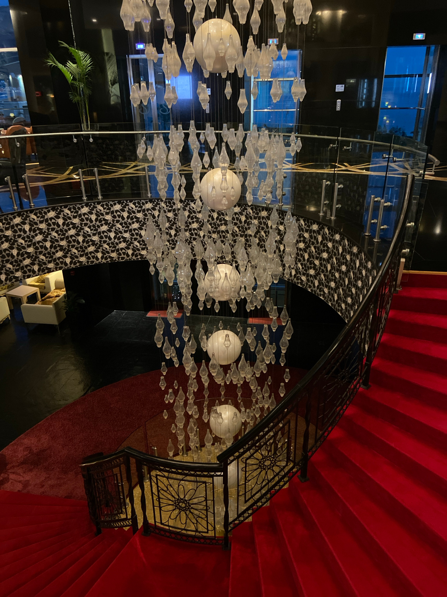The image shows an interior view of a luxury establishment, possibly a hotel or upscale event venue in Boreti, Montenegro. The foreground features a unique lighting fixture composed of spherical bulbs suspended amidst a cloud of smaller, decorative, bottle-shaped clear ornaments. The backdrop showcases a spiraling staircase with a red carpet, contrasted by a patterned wall detail with black-and-white floral motifs. The architectural design is modern, with reflective surfaces and clean lines. A glimpse of the outdoors is visible through the windows, with a glimpse of plant life indoors. | Open Wire