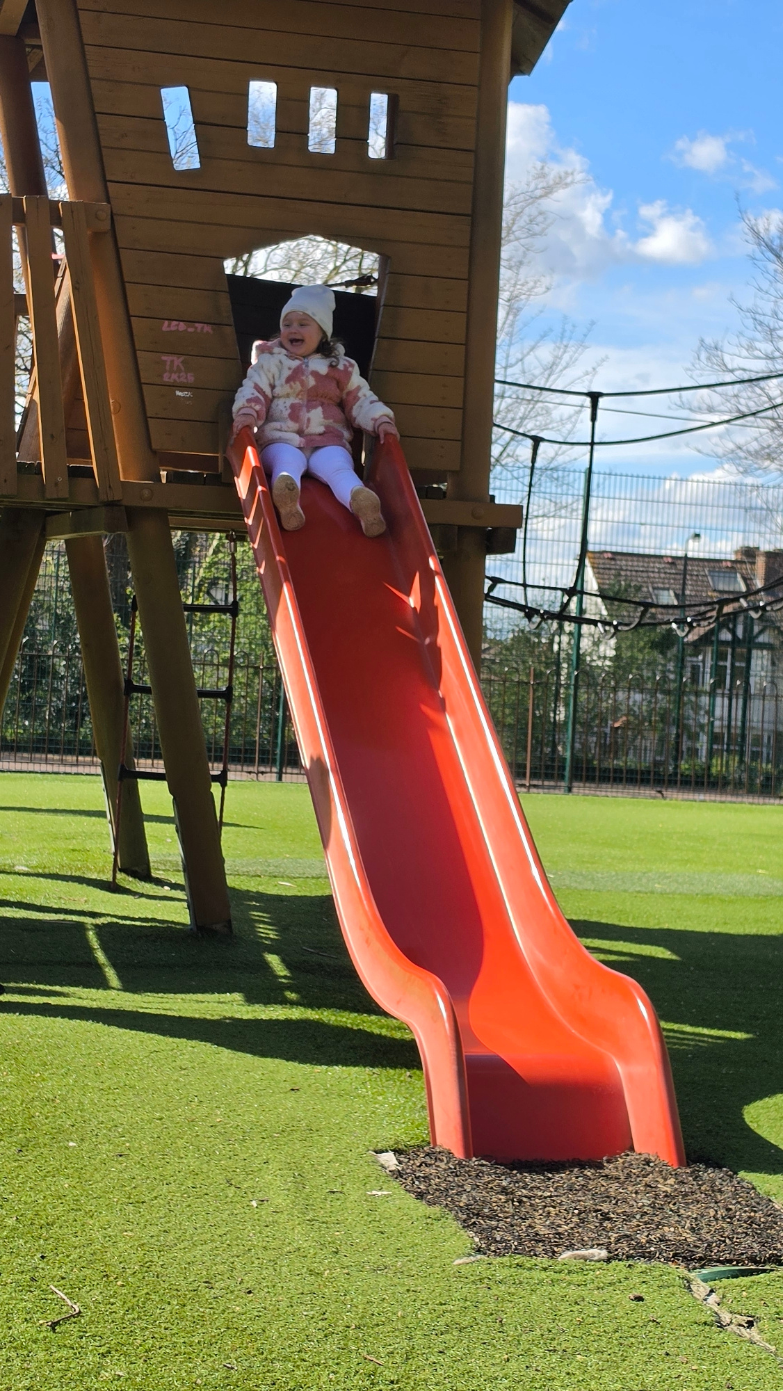 A young child in a patterned jacket and white leggings and hat is sliding down a red slide that is attached to a wooden play structure. The slide exits onto a green surface with what appears to be shr…read more