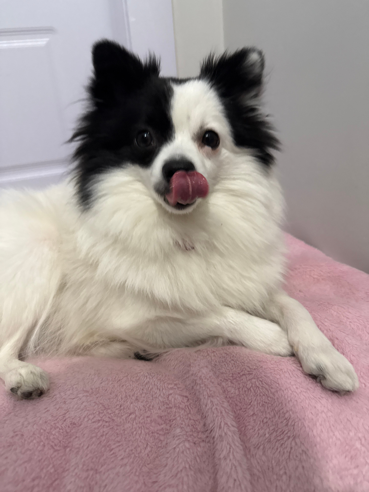 A medium shot captures a black and white dog lying on a pink blanket. The dog has long, white fur with black markings around its eyes and ears. Its tongue is visible, extending slightly out of its mou…read more
