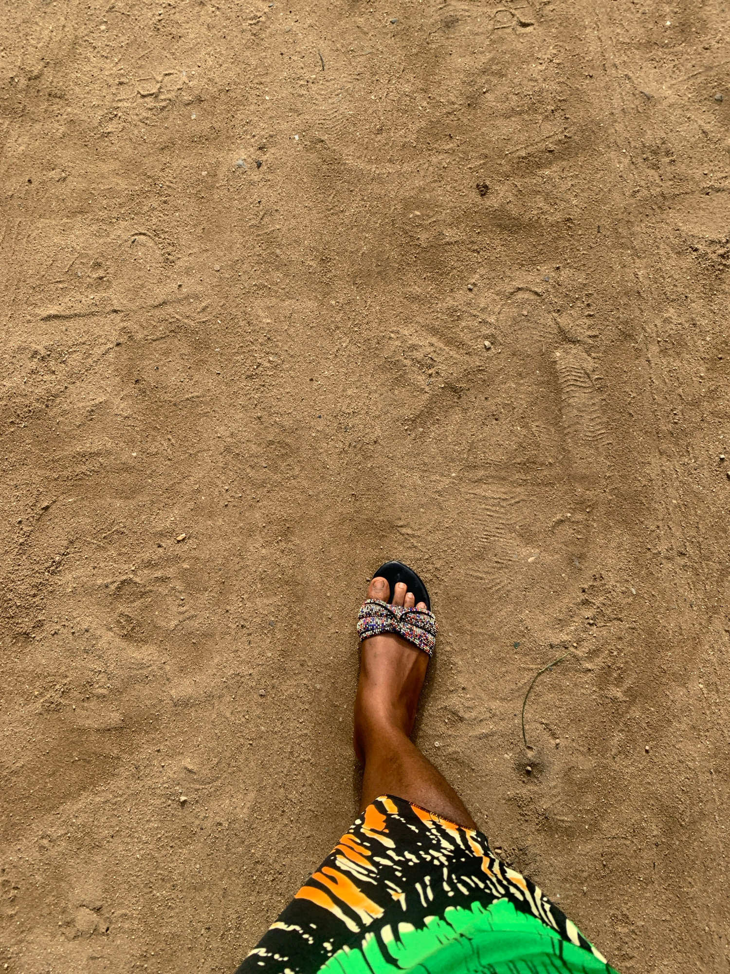 An overhead shot shows a person's leg and foot in a beaded sandal resting on a sandy, light brown surface. The person is wearing a green, black, and orange patterned garment. The sand appears to be co…read more