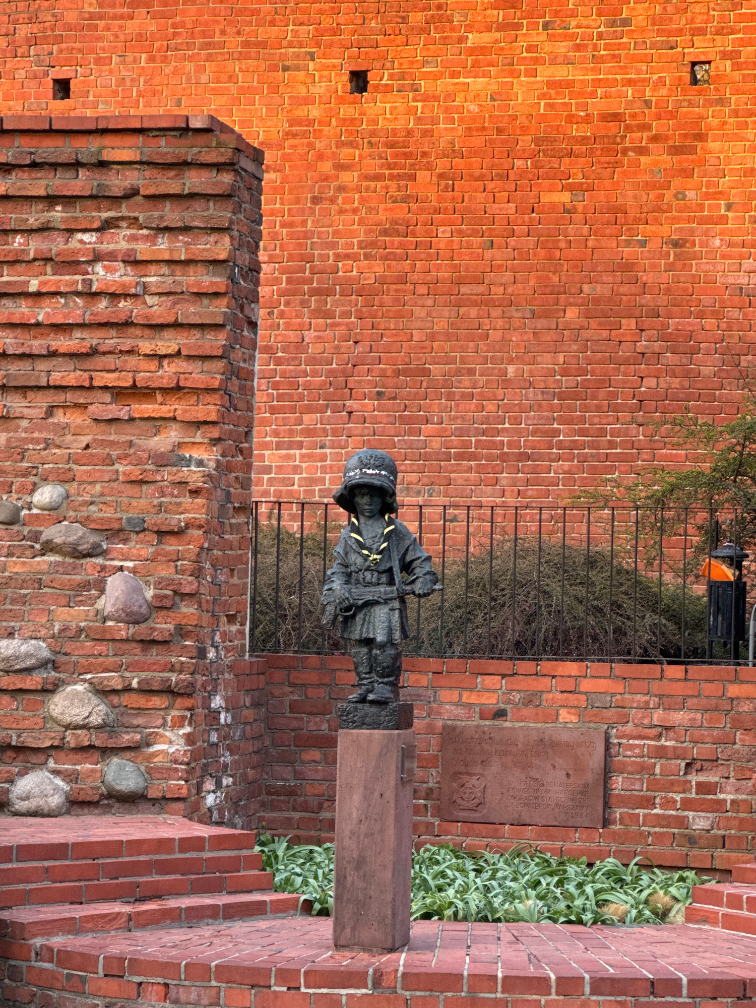 The image shows the Little Insurgent monument in Warsaw, Poland, standing in front of a brick wall. The monument is a bronze statue of a young boy wearing a helmet and carrying a weapon. It commemorat…read more