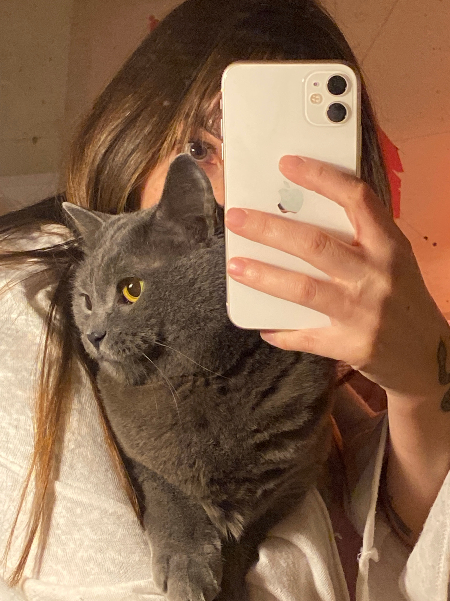 A person with long brown hair is holding a white iPhone over a gray cat, taking a selfie. The cat is lying on a white surface, possibly a bed or blanket. The person's hand is visible, holding the phon…read more