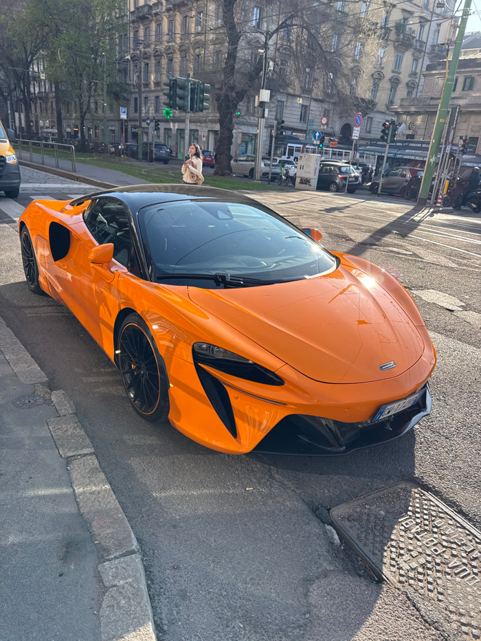 An orange McLaren Artura supercar, featuring a black roof and black wheels with orange pinstripes, is parked on the right side of an asphalt street, angled towards the right. Minor surface marks are v…read more