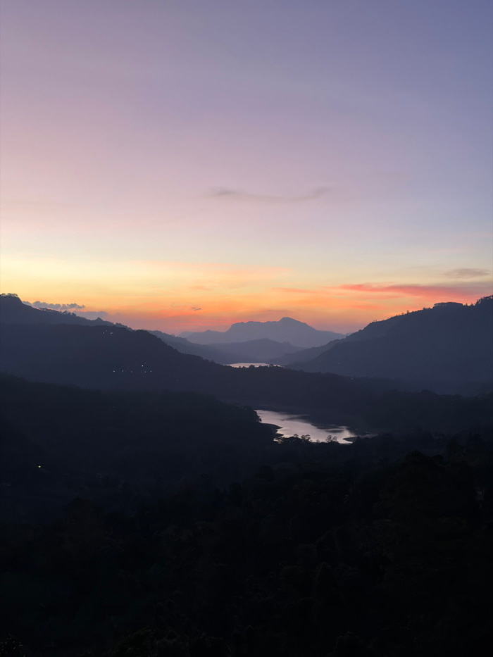 The image depicts a panoramic landscape view during twilight in Ramboda, Sri Lanka. The sky transitions from a deep purple at the zenith, through lavender and pink hues, to a vibrant orange and yellow…read more