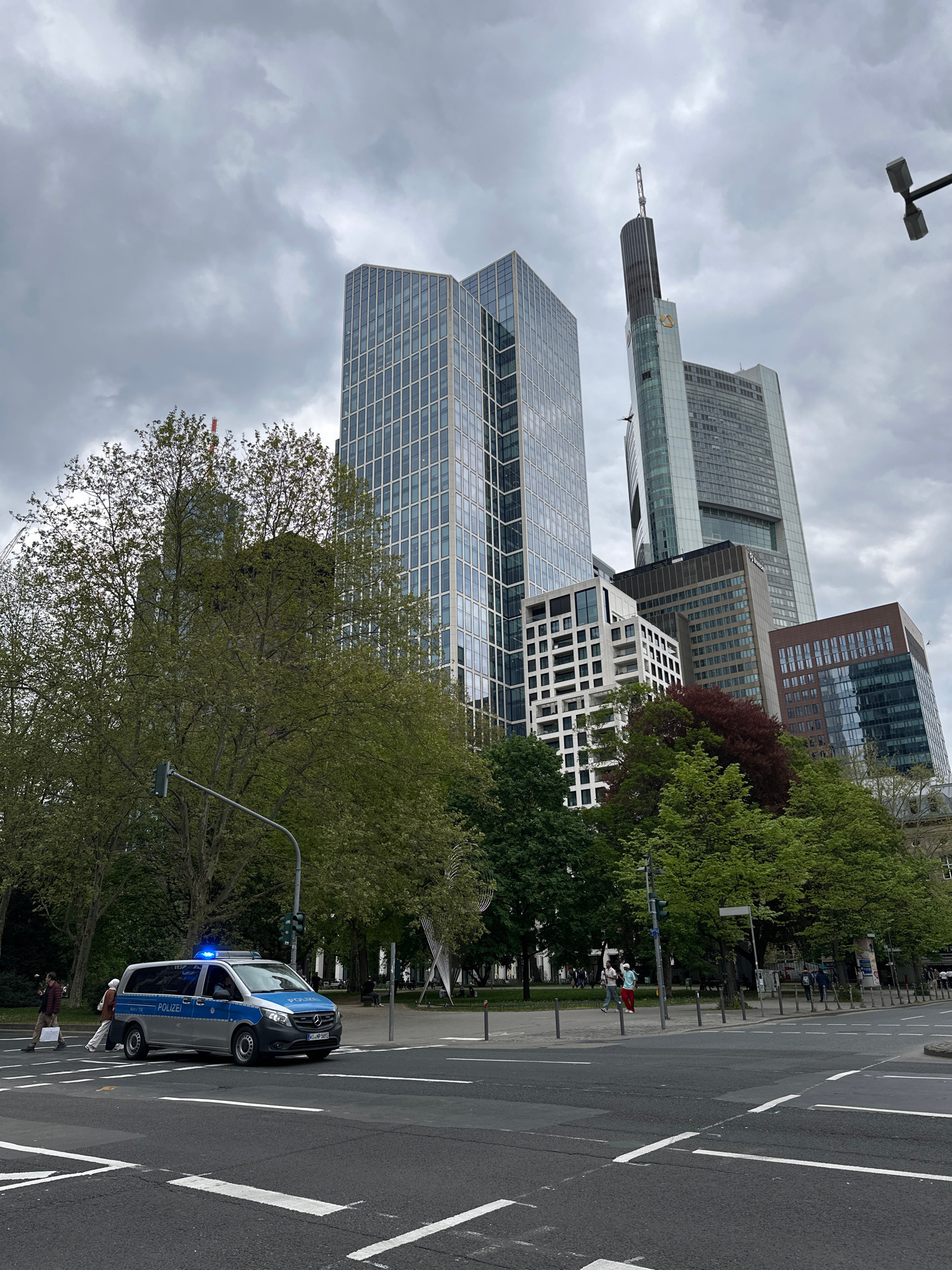 The image presents an urban landscape dominated by modern high-rise buildings under an overcast, cloudy sky. The scene depicts a city street lined with trees and a parked police vehicle. In the backg…read more