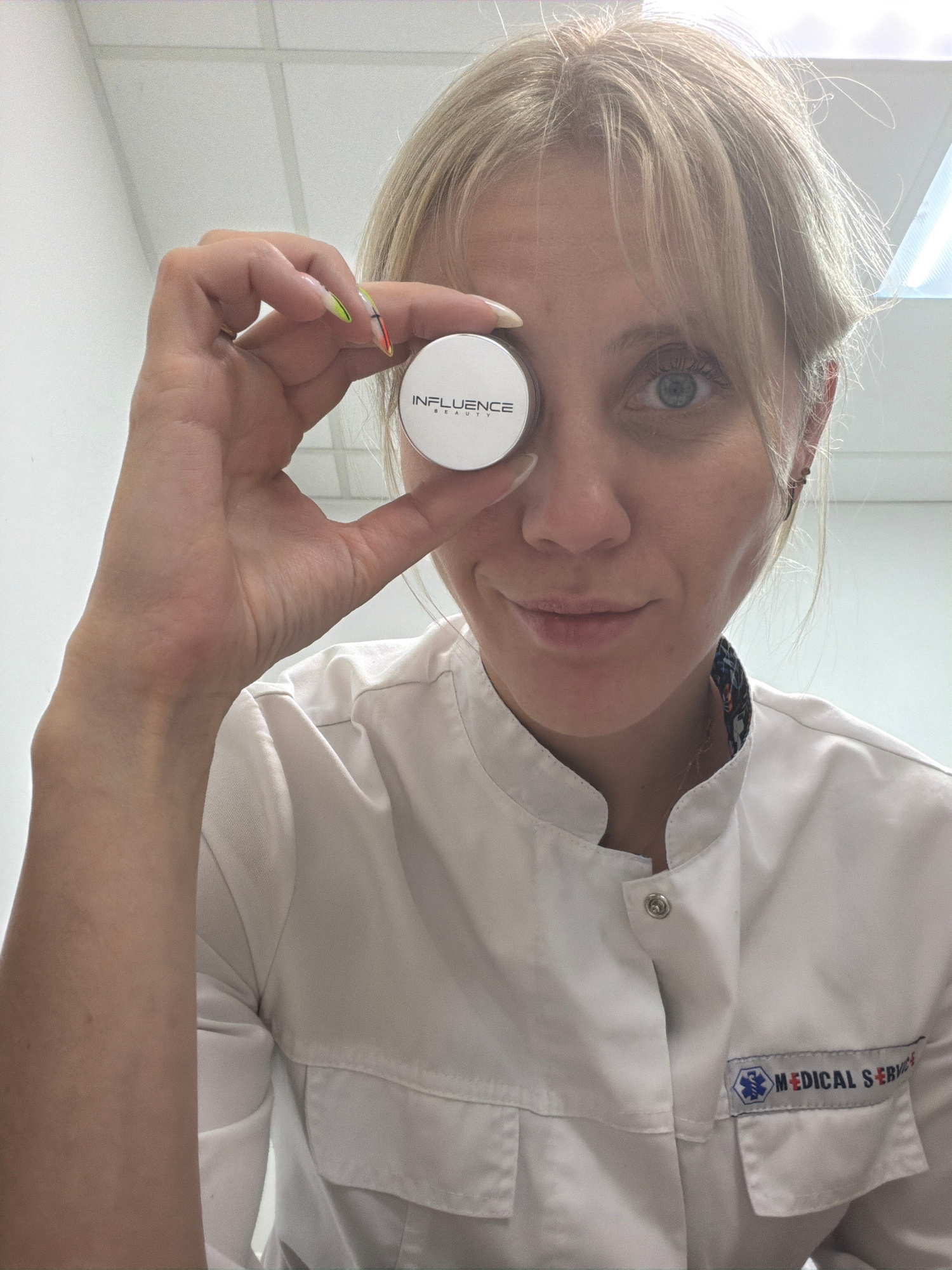 A Caucasian woman with blonde hair and blue eyes, wearing a white "MEDICAL SERVICE" shirt, is holding a white jar labeled "INFLUENCE BEAUTY" near her right eye. The scene appears to be indoors. The lo…read more
