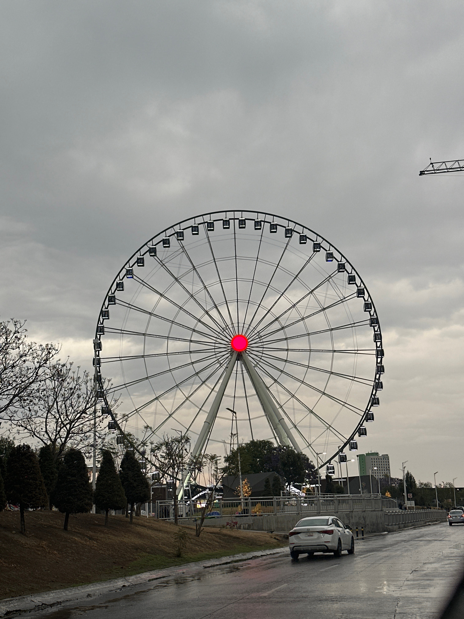 The image features a large Ferris wheel dominating the scene, positioned on the side of a wet roadway. The wheel's structure is black, with a red light at its center. The sky is overcast and gray. A f…read more