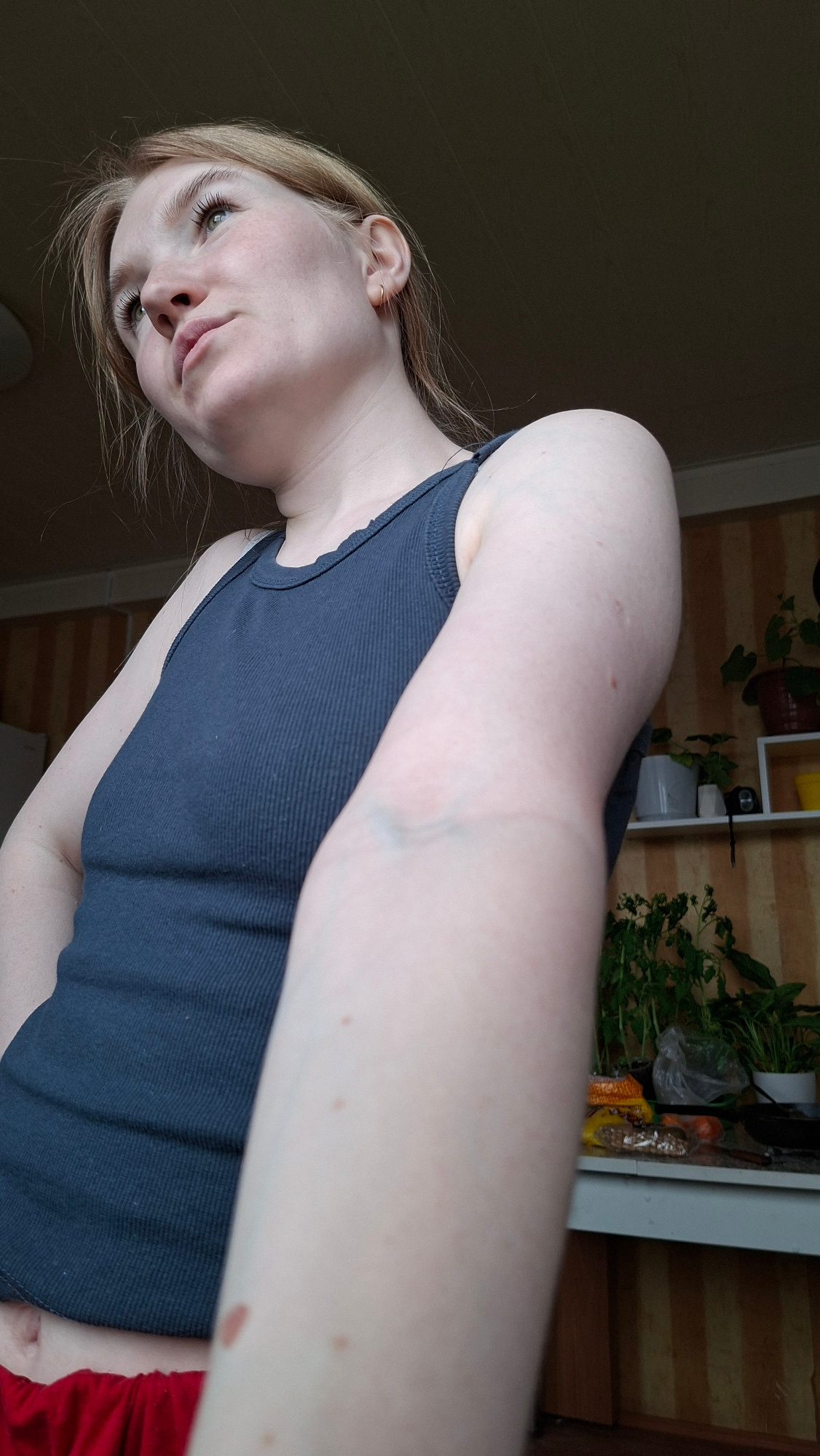 The image is a selfie of a young person, likely female, with fair skin and light-colored hair, taken from a high angle and rotated 90 degrees clockwise. The subject is looking towards the camera with…read more