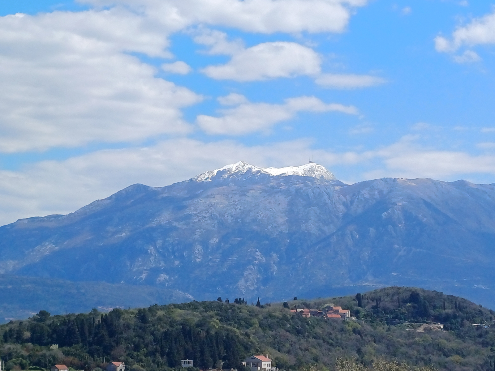The image shows a mountainous landscape under a blue sky with scattered white clouds. The prominent mountain has a snow-capped peak with a tall antenna structure on top. The lower part of the image fe…read more