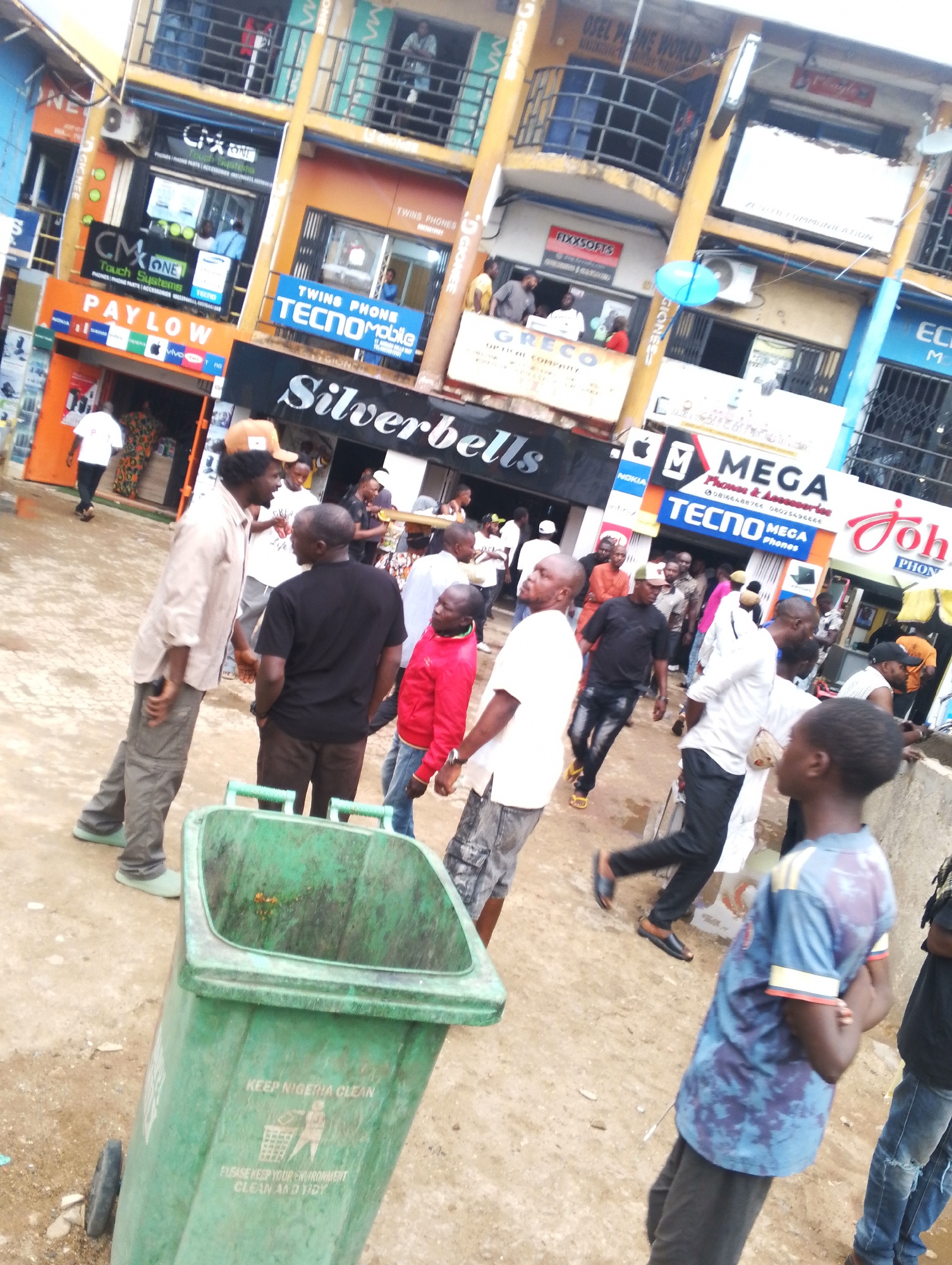 The image shows a busy street scene in Jos, Nigeria. Several people are walking around, some interacting with each other. Shops line the street, advertising mobile phones and accessories. Visible shop…read more