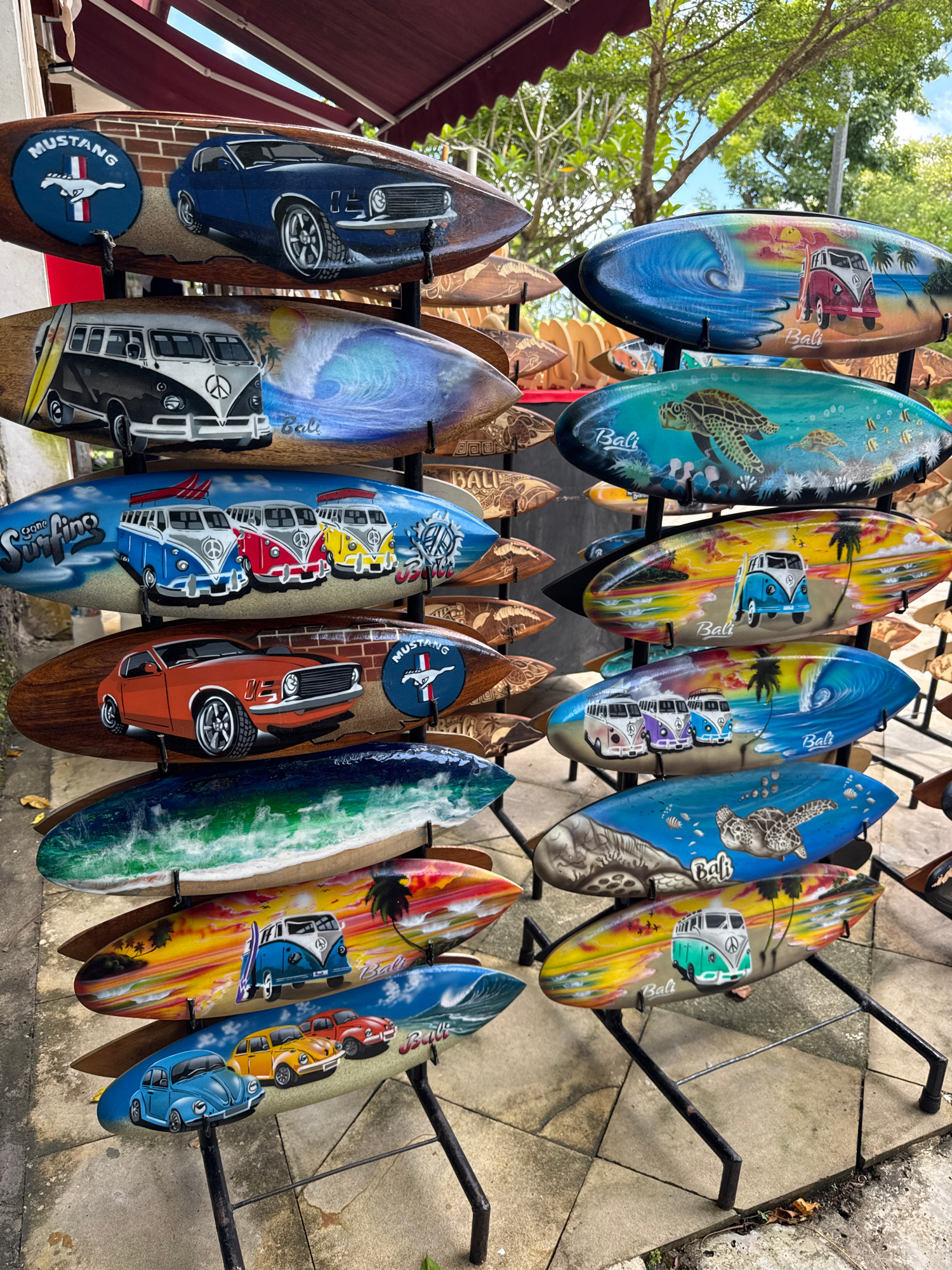 The photograph shows a display of decorative wooden surfboards hanging on a black metal rack. These surfboards, likely souvenirs, have various designs, including classic cars, Volkswagen vans, and sea…read more