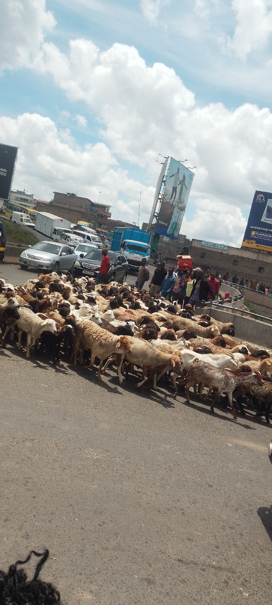 A large flock of sheep is crossing a busy street in Nairobi, Kenya, halting traffic. Numerous vehicles, including cars, trucks, and vans, are backed up behind the sheep. Several people, presumably her…read more