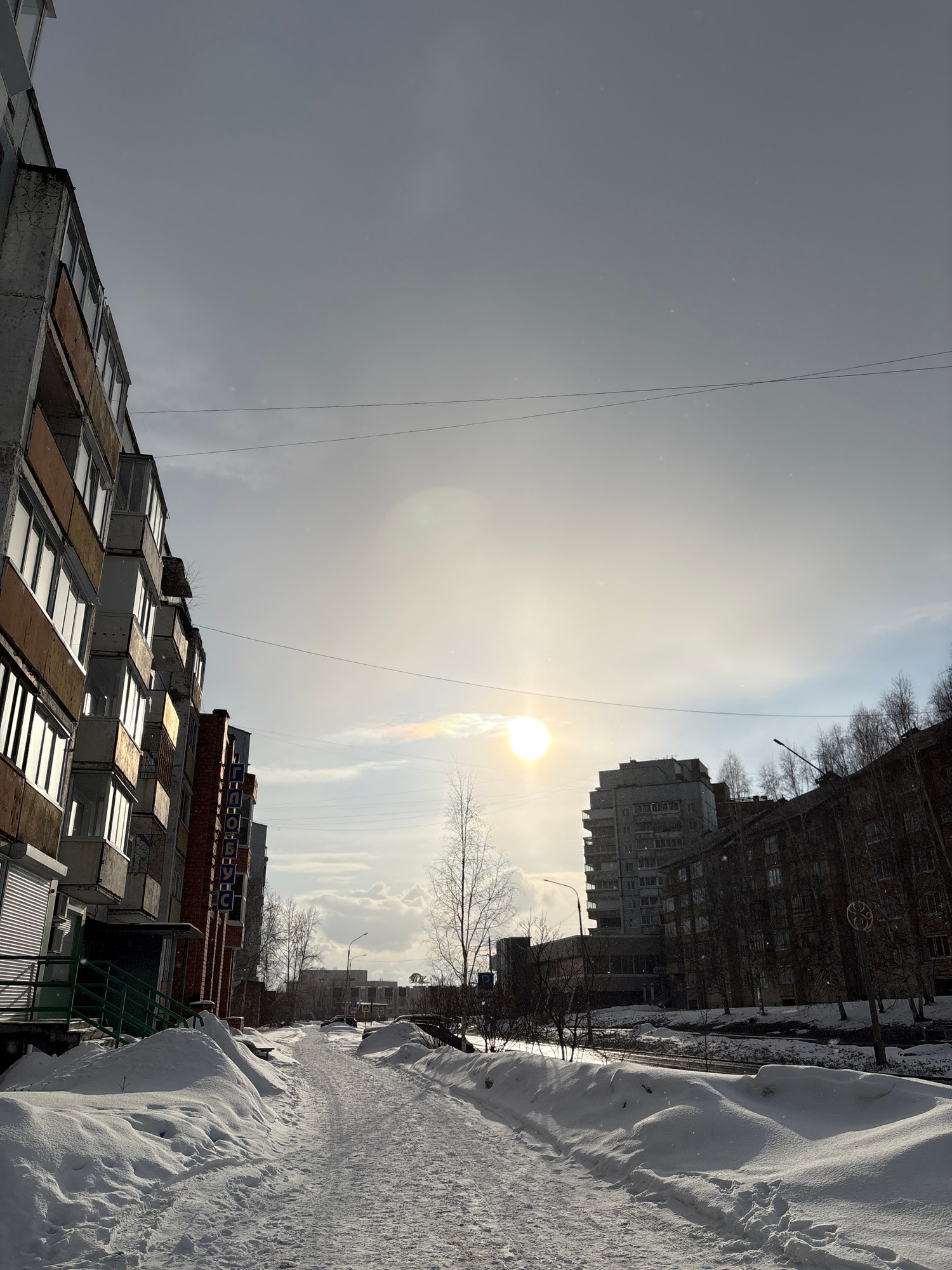 The image captures a winter scene in what appears to be a residential area of Ust-Ilimsk, Russia. The viewpoint is from the ground level, looking up at buildings under a bright, hazy sun. Snow is heav…read more