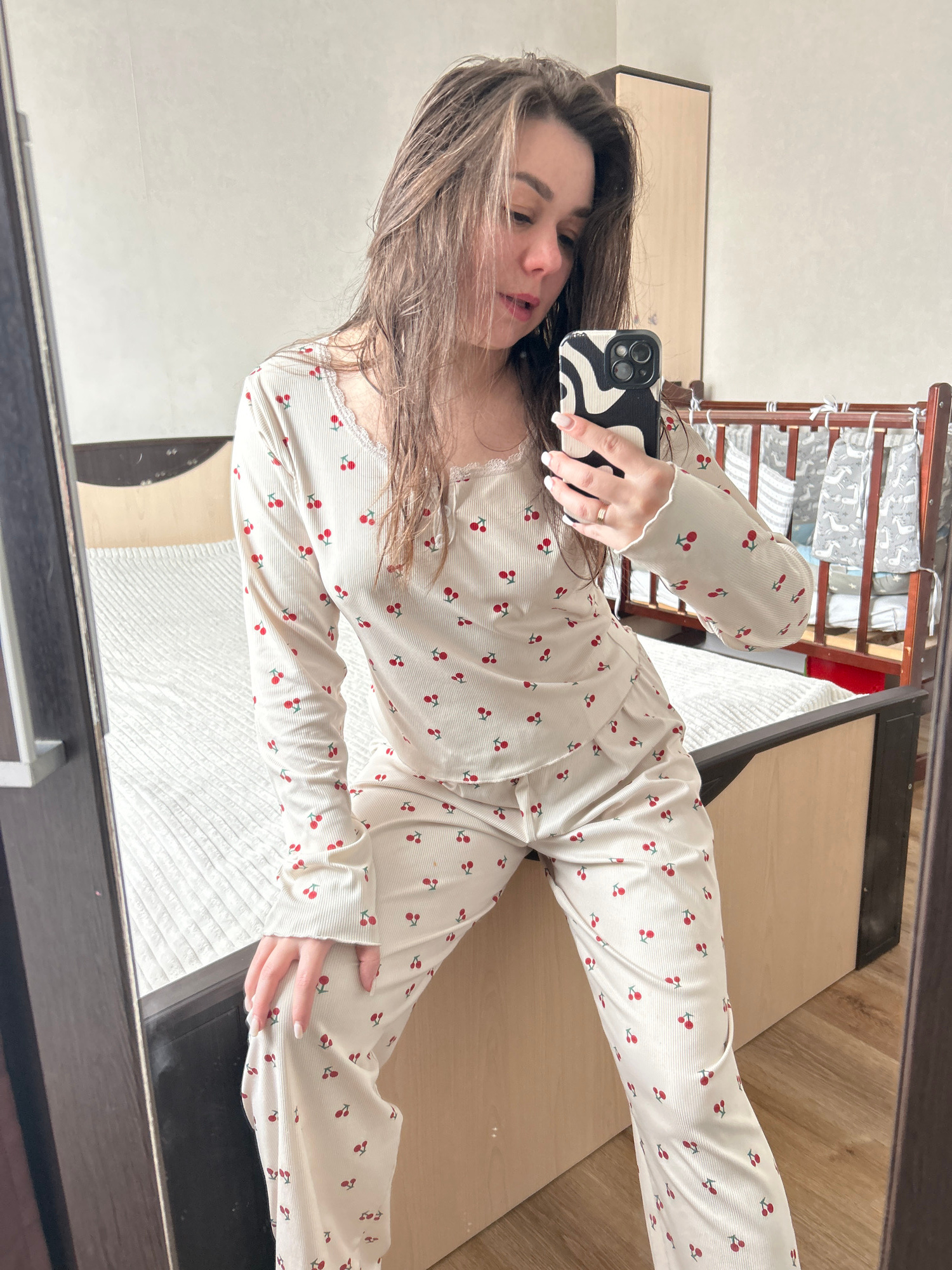 A woman is seen in a mirror selfie, wearing a long-sleeved pajama set with a cherry print. She is holding a black and white patterned phone. The reflection shows a bedroom setting with a bed in the ba…read more