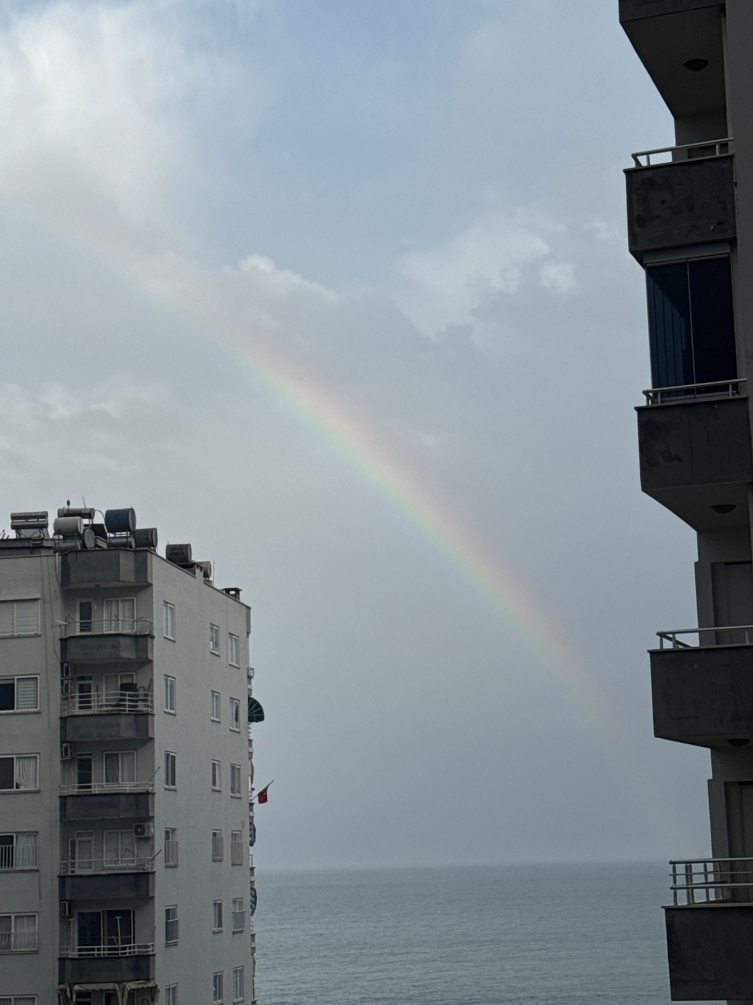The image, rotated counter-clockwise, shows a partial rainbow arching across a cloudy sky in Erdemli, Turkey. The scene is framed by the architecture of buildings. One structure in the foreground is a…read more
