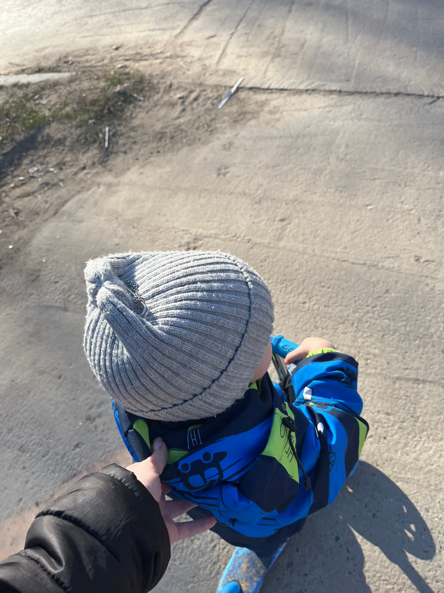 A top-down shot shows a child in a grey knit cap and a blue and black jacket. The child appears to be on a blue scooter. An adult's hand in a black jacket sleeve reaches towards the child. The scene i…read more