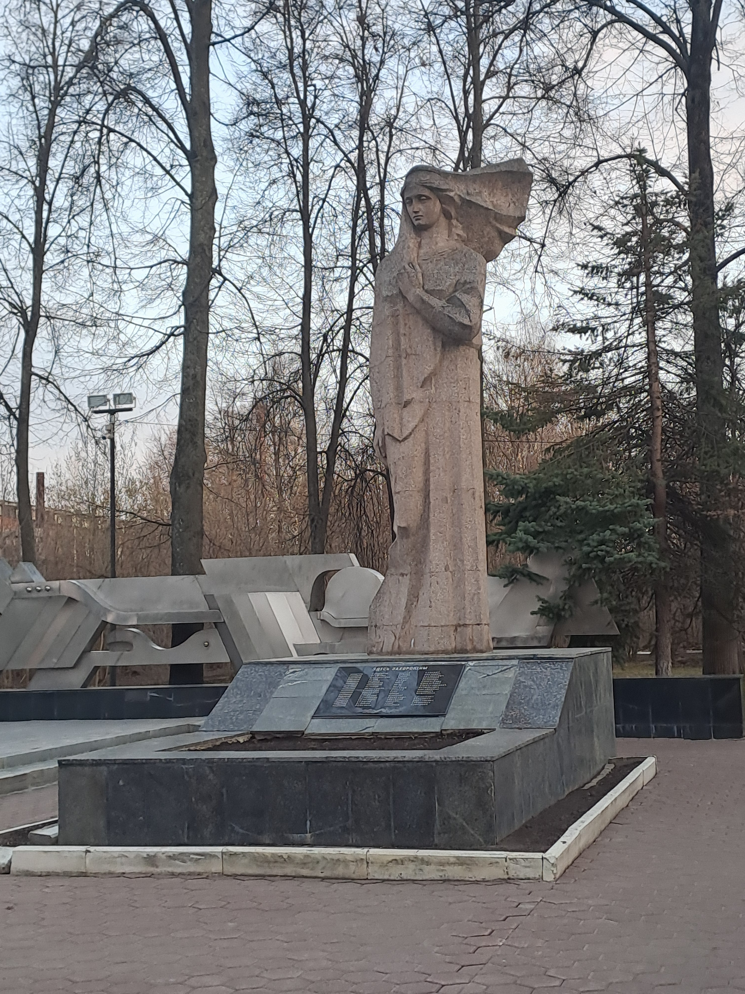 The image shows a monument in Elektrostal, Russia. The monument consists of a stone sculpture of a woman and a granite structure with inscriptions. The woman is depicted in a flowing garment, with her head covered and arms crossed. The granite structure features rectangular plates with text written in Russian. Trees and bare branches are visible in the background, suggesting it may be late autumn or winter. A light pole and paved walkway are also part of the scene. | Open Wire
