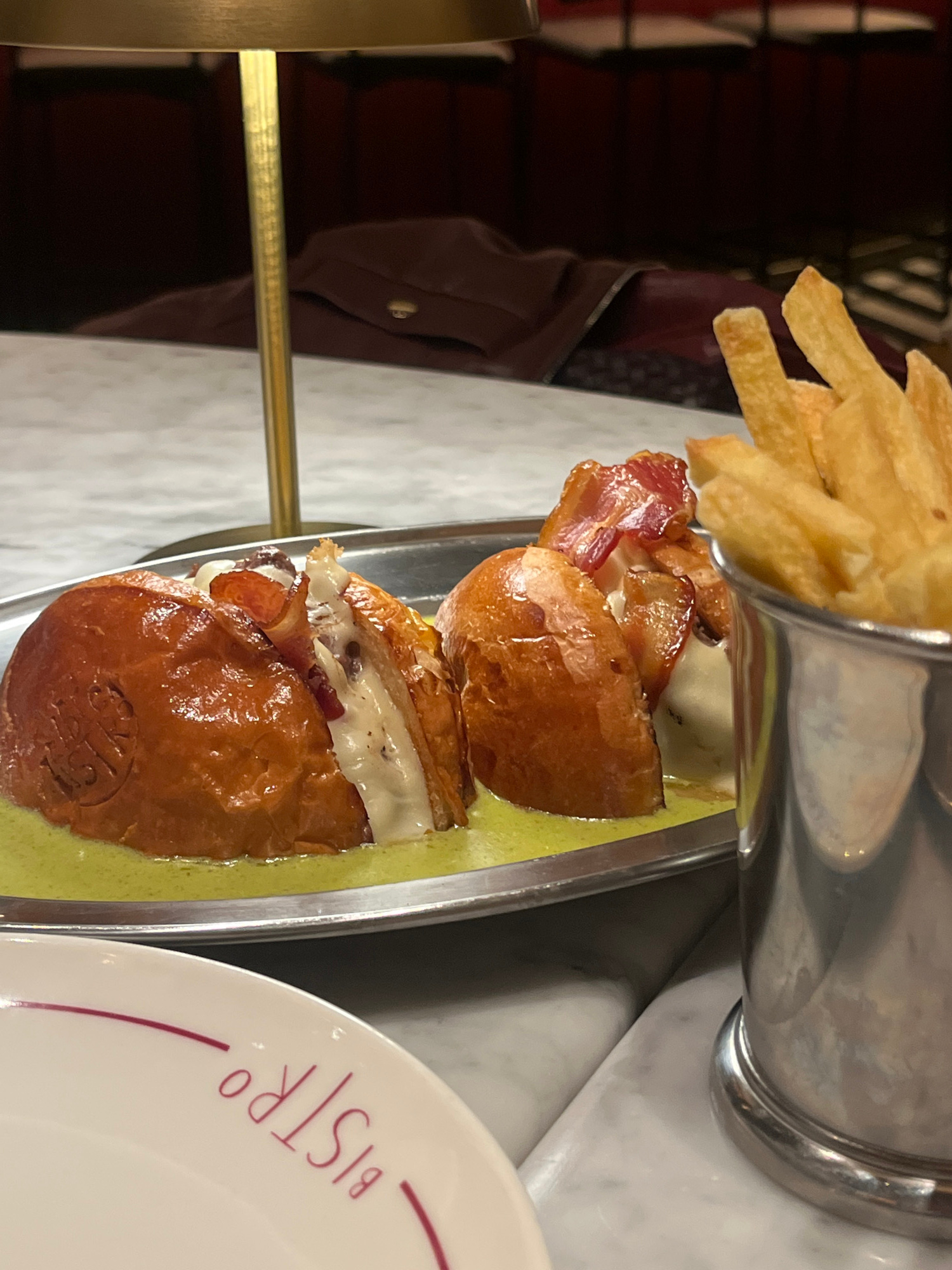 A close-up, slightly angled shot depicts a food presentation likely in a restaurant setting. A metal cone filled with french fries is positioned above a silver oblong tray, on which are two mini-burge…read more