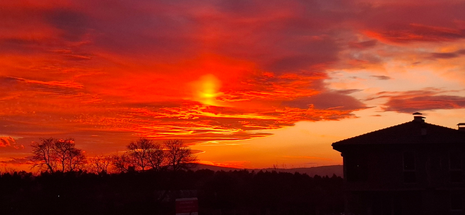 The image captures a vibrant sunset over Burgas, Bulgaria, as indicated by the presence of a residential building silhouette typical of the area. The sky is ablaze with intense red and orange hues, wi…read more