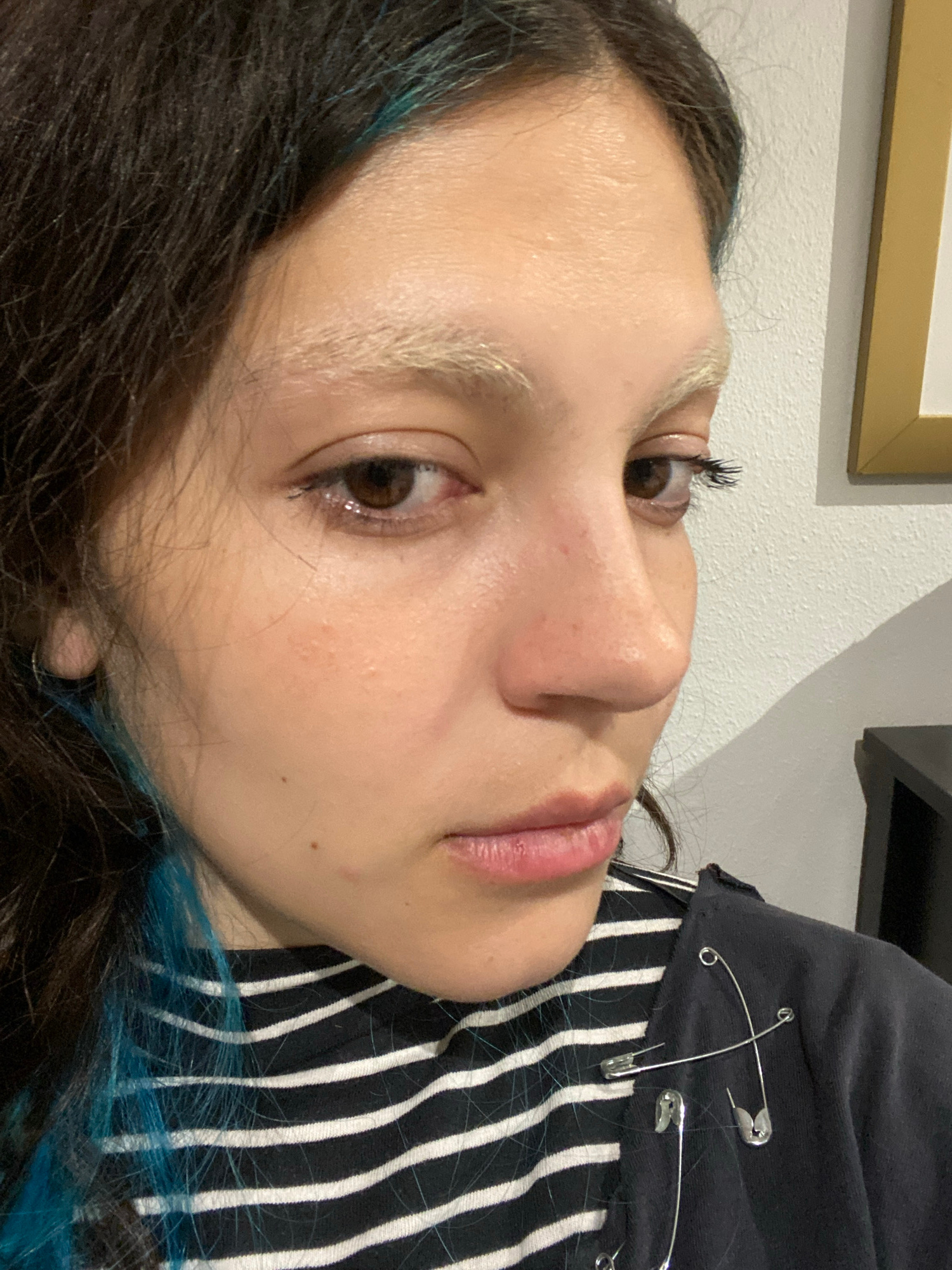 A close-up, angled shot of a person's face and upper body. The person has fair skin, light blonde eyebrows, and brown eyes. Their dark brown hair has strands of blue. They are wearing a black and whit…read more